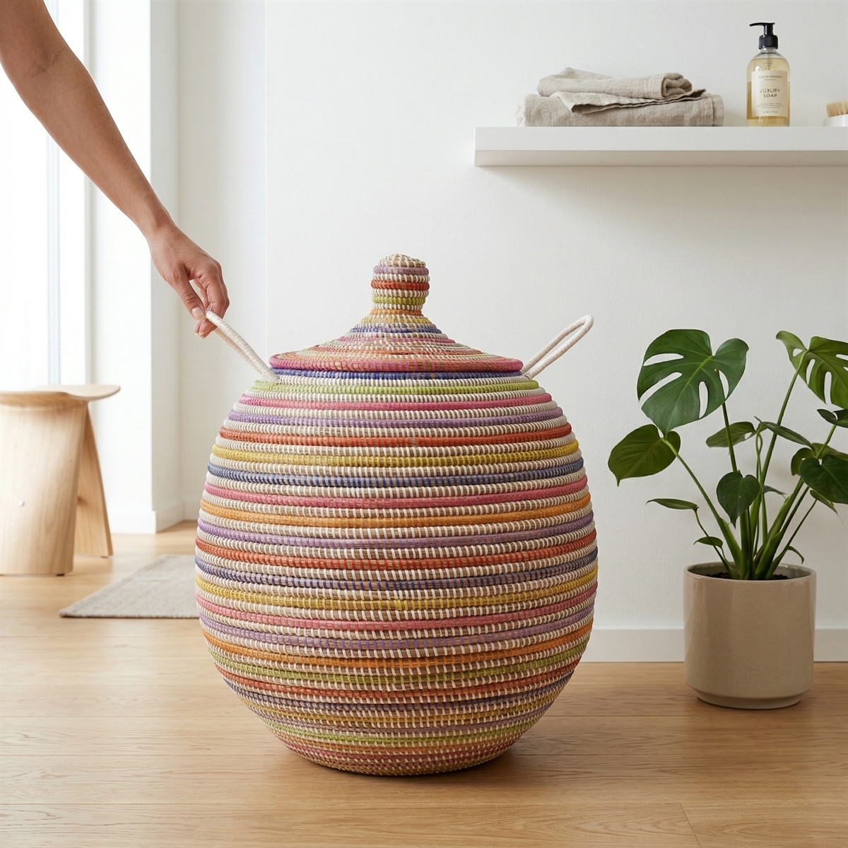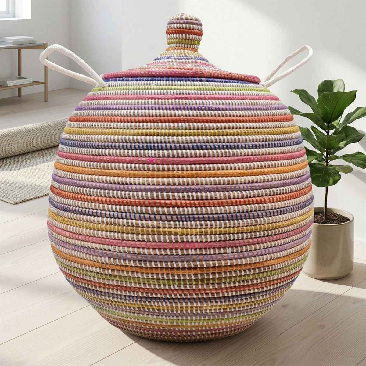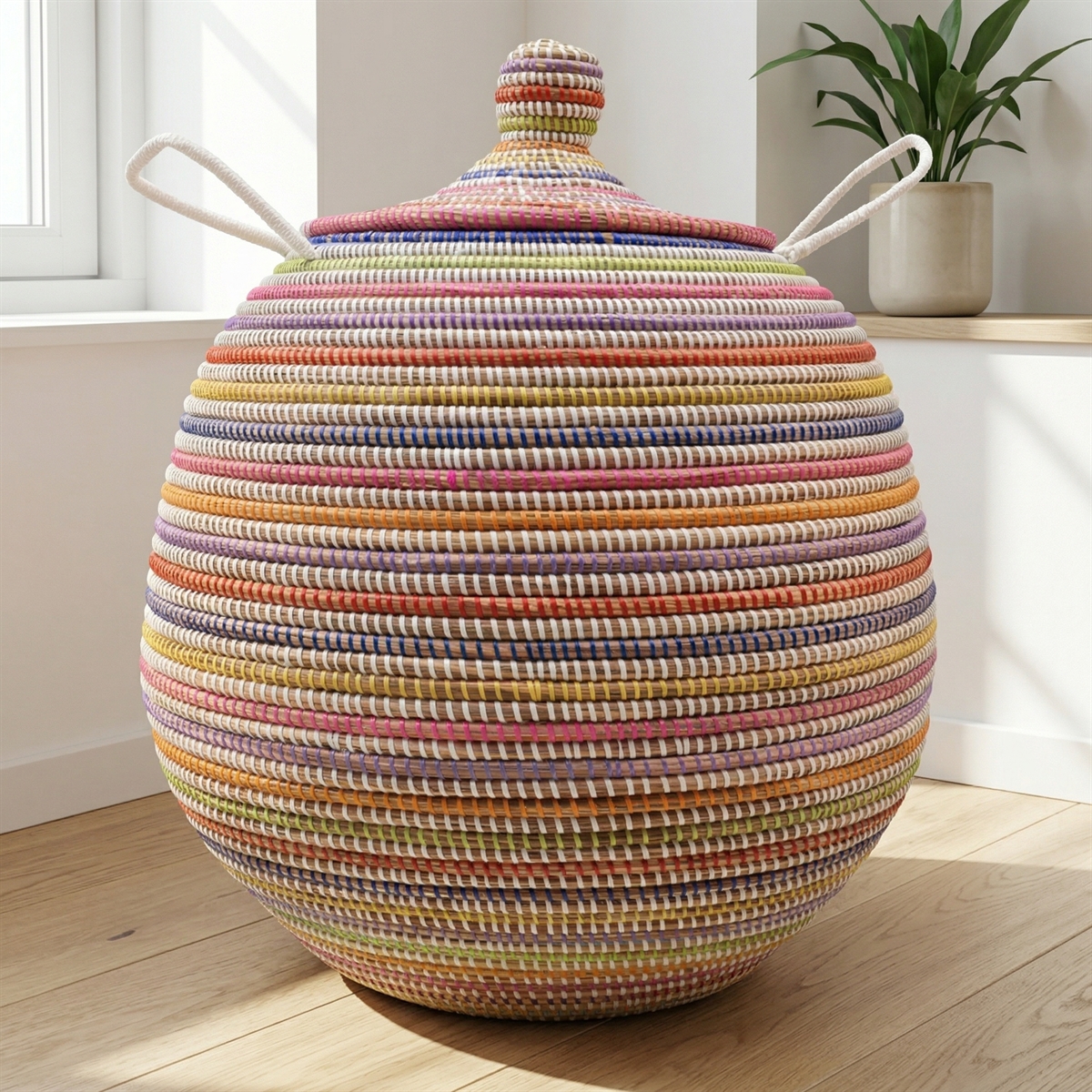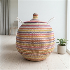 Alibabakurv i multicolor i størrelsen vi kalder Stor. Håndlavet i Senegal i naturmateriale med plaststrips i multicolor flettet indimellem. Med det velkendte slangetæmmerlåg.