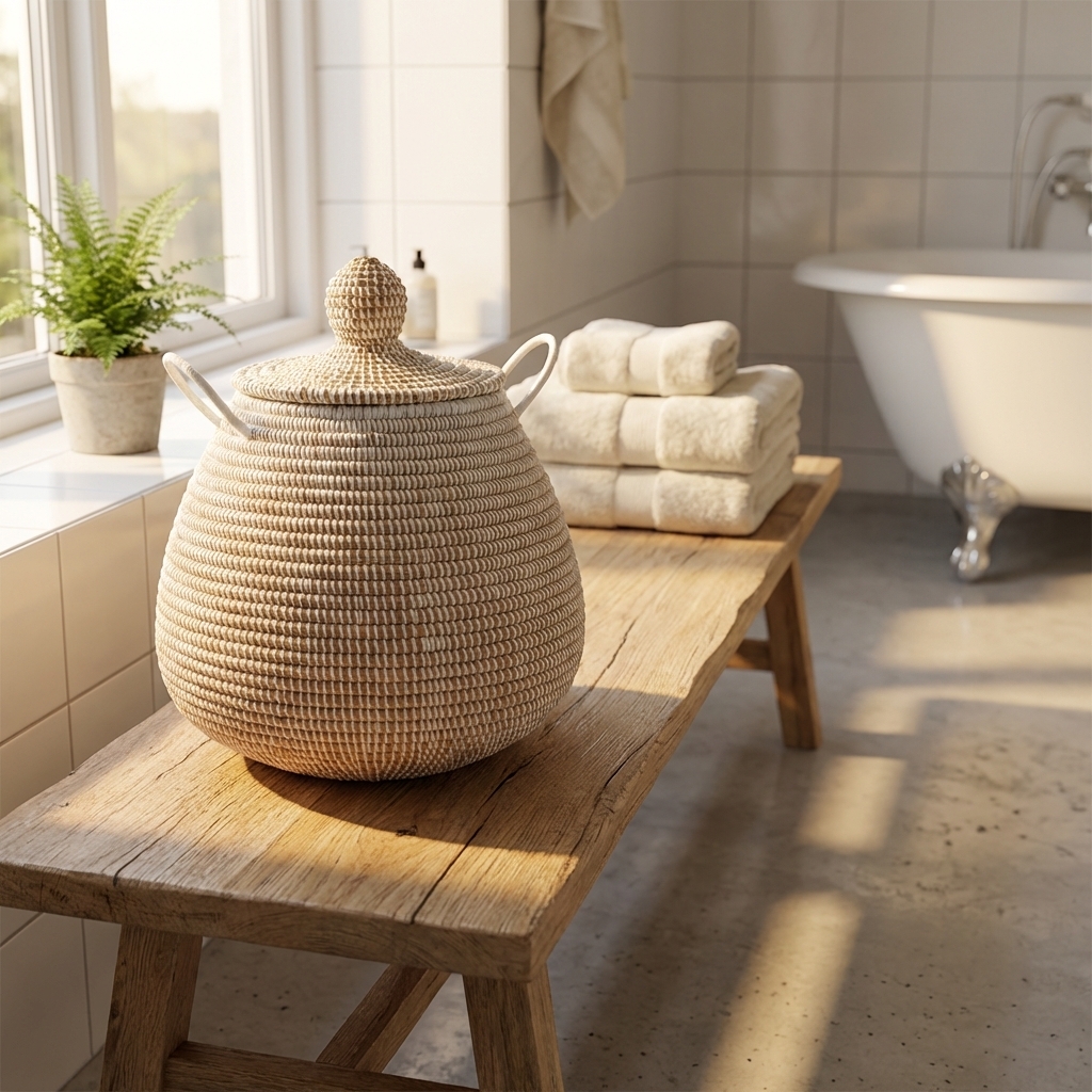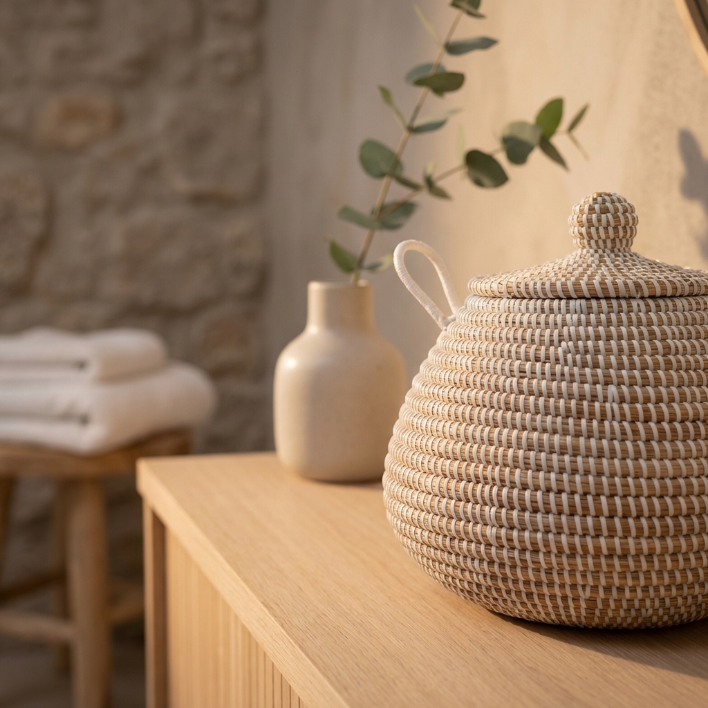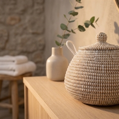 Alibabakurv i hvid i størrelsen vi kalder lille. Kurven er håndlavet i Senegal i naturmateriale med hvide plaststrips flettet indimellem. Med det velkendte slangetæmmerlåg.