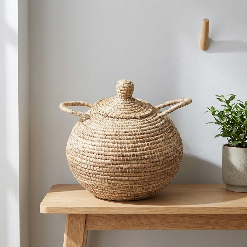 Alibabakurv i farven natur i størrelsen vi kalder lille. Kurven er håndlavet i Senegal i naturmateriale med naturlig farvet natursnor flettet indimellem. Med det velkendte slangetæmmerlåg.