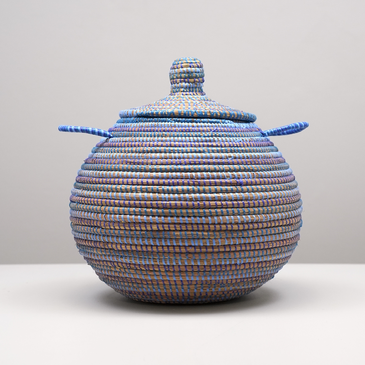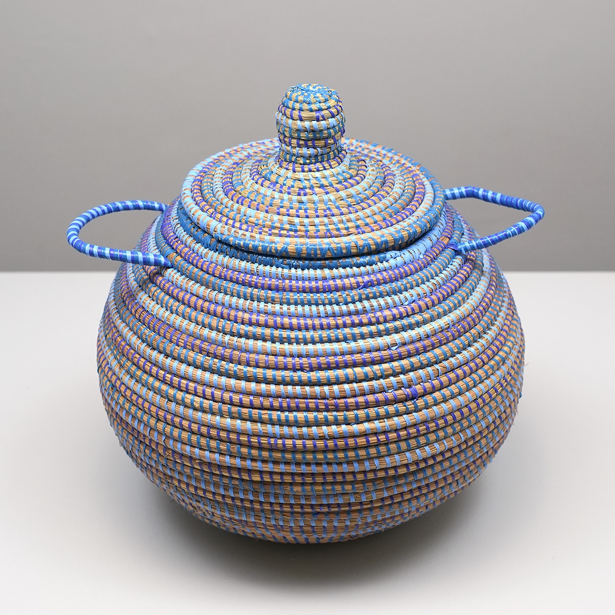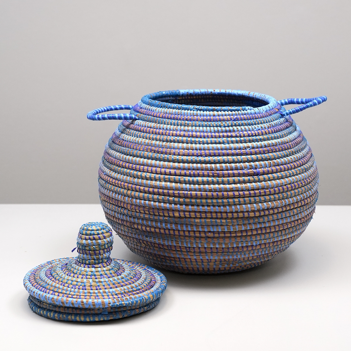 Alibabakurv i hvid i størrelsen vi kalder lille. Kurven er håndlavet i Senegal i naturmateriale med blå plaststrips flettet indimellem. Med det velkendte slangetæmmerlåg.