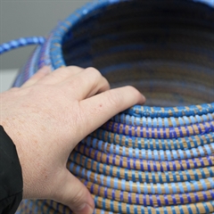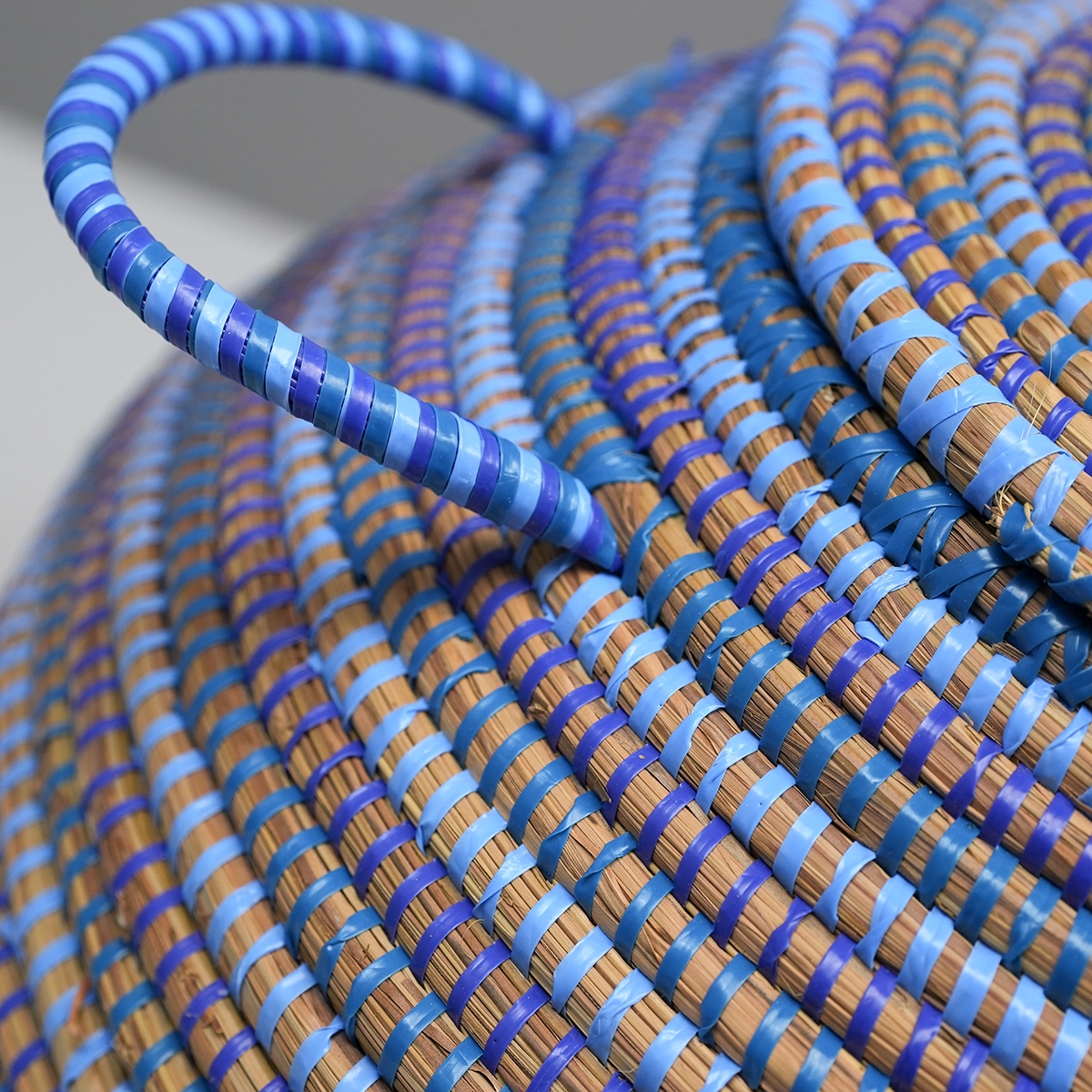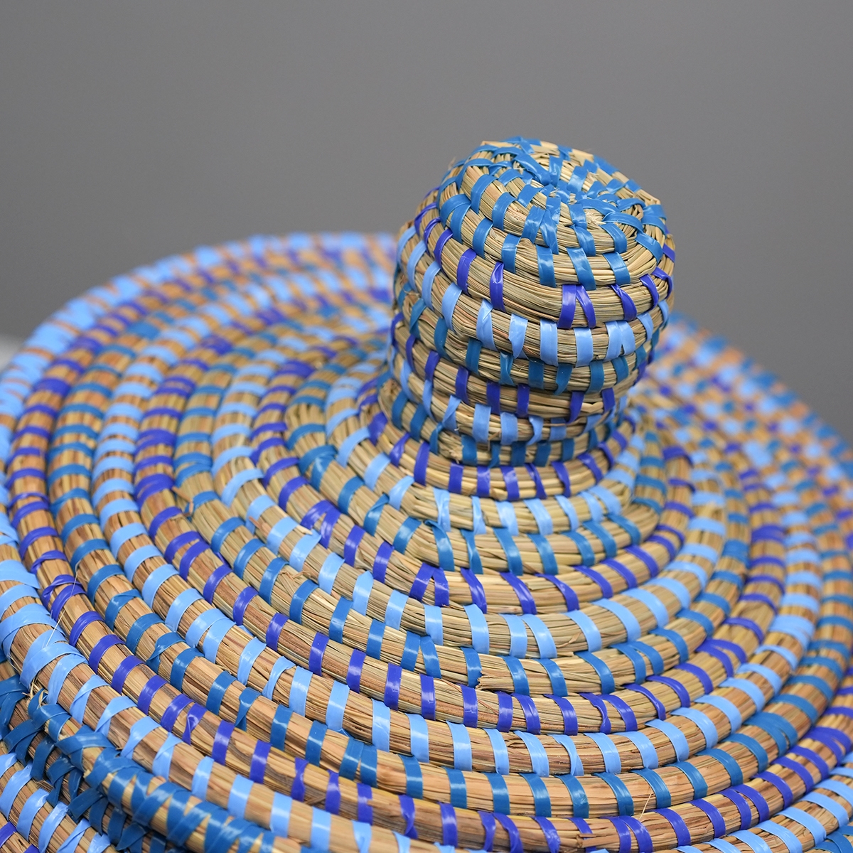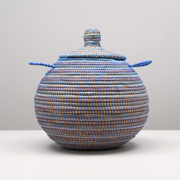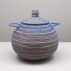 Alibabakurv i hvid i størrelsen vi kalder lille. Kurven er håndlavet i Senegal i naturmateriale med blå plaststrips flettet indimellem. Med det velkendte slangetæmmerlåg.