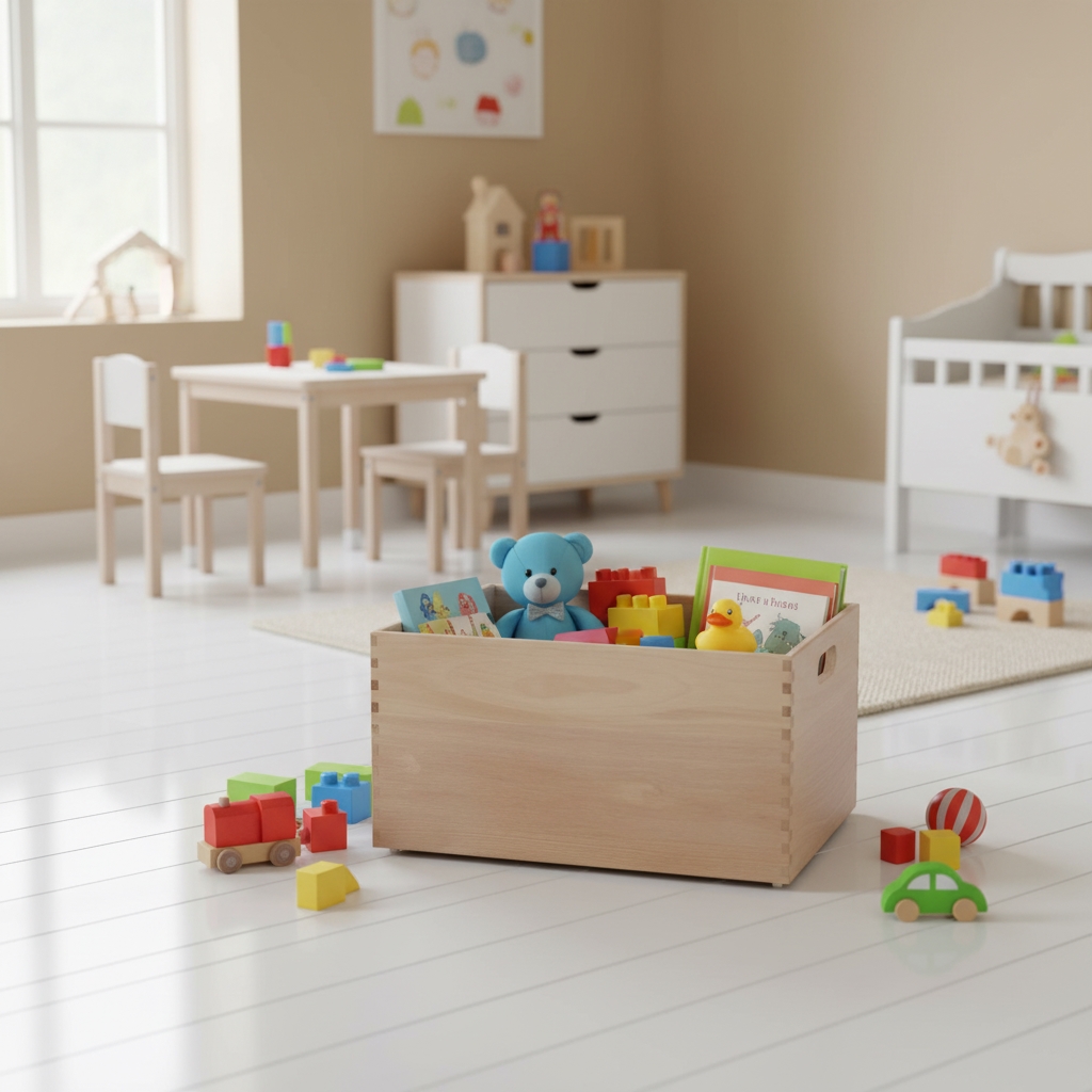 Stabelbar opbevaringskasse i lakeret bøgetræ, fra Zeller.