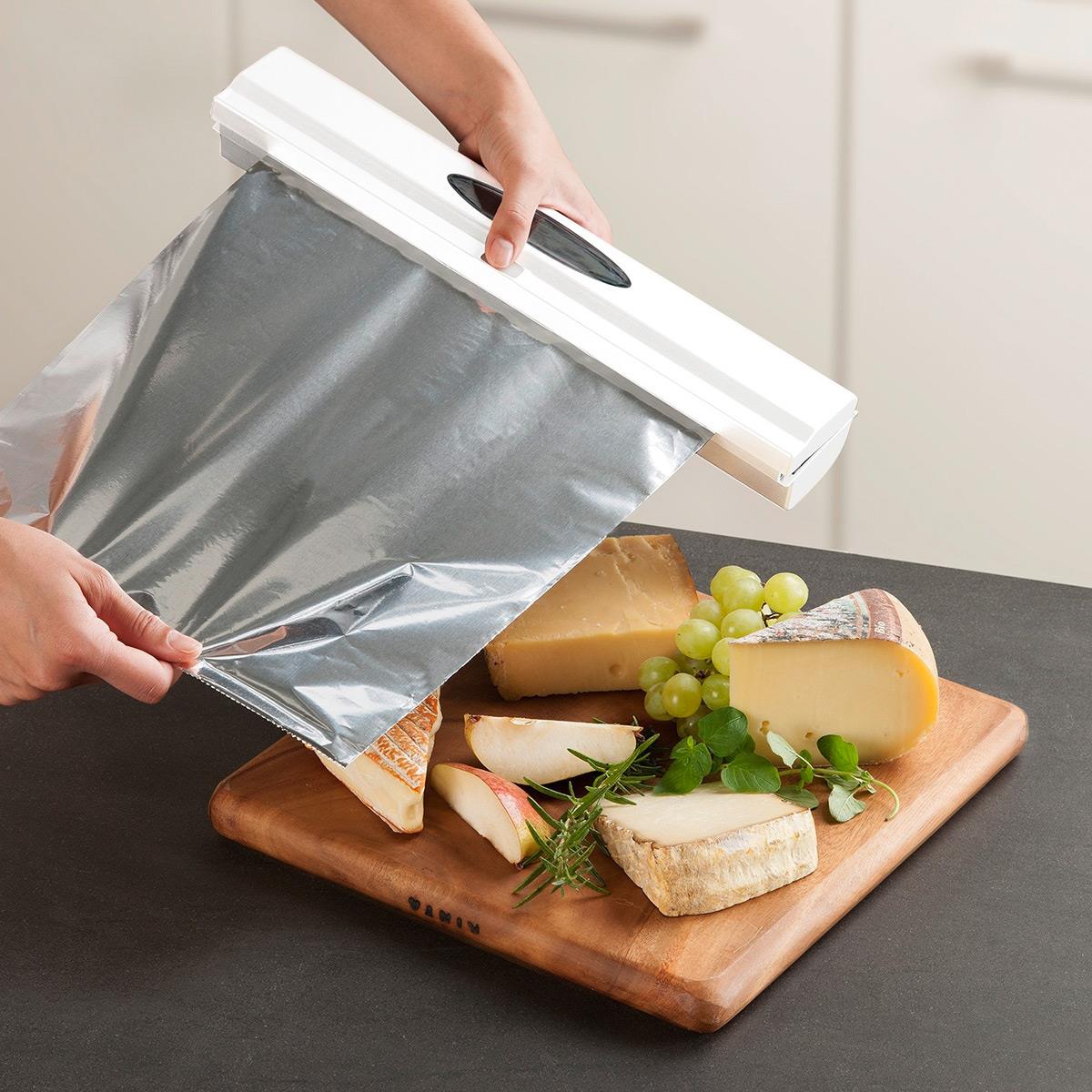 Den smarte holder gør det nemt at opbevare din rulle med husholdningsfilm eller alufolie. Holderen har en hakket kniv så du let med 1 klik kan skære et stykke film eller folie når du skal bruge det. Nem at bruge og passer lige ned i de fleste skuffer.