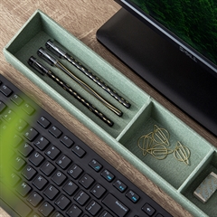 Ruminddelt penneholder i grøn til kuglepenne, klips, post it's og diverse små tilbehør på kontoret.