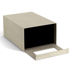 Kassen er lavet af fiberplader som er lavet af genbrugspap. Beklædt med linenfarvet papir der føles som kanvas. Produceret i Litauen