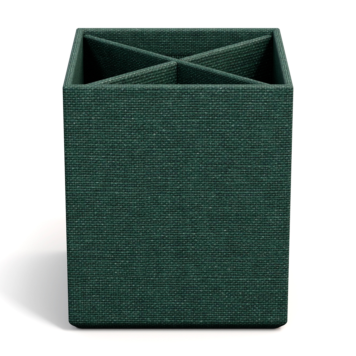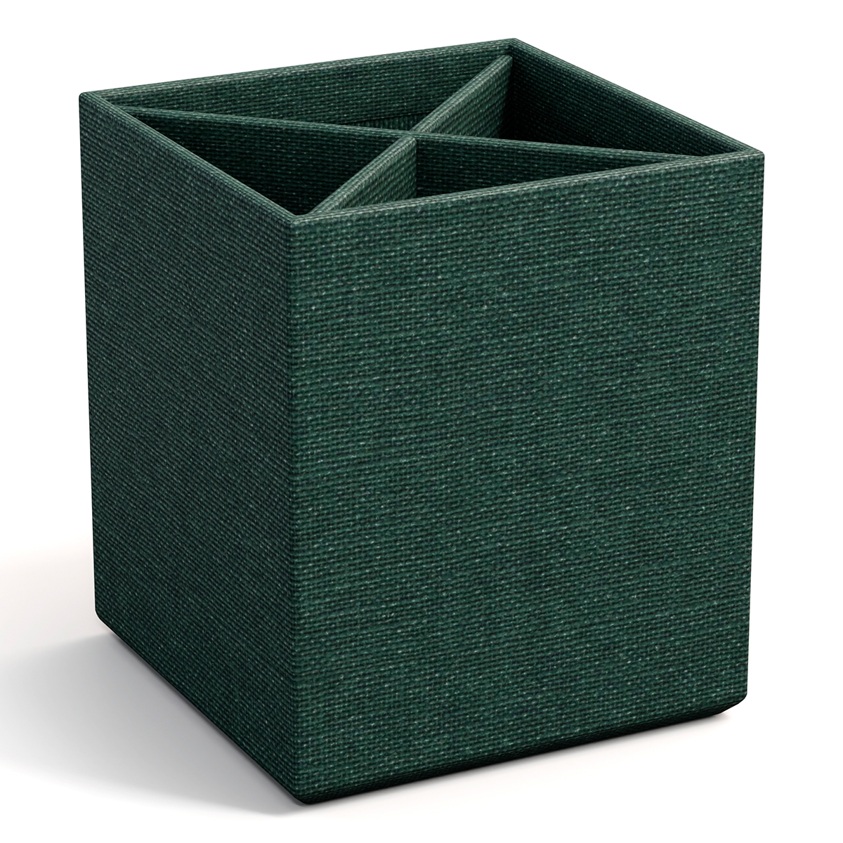 Penneholderen er lavet i kraftigt pap beklædt med mørkegrønt kanvas