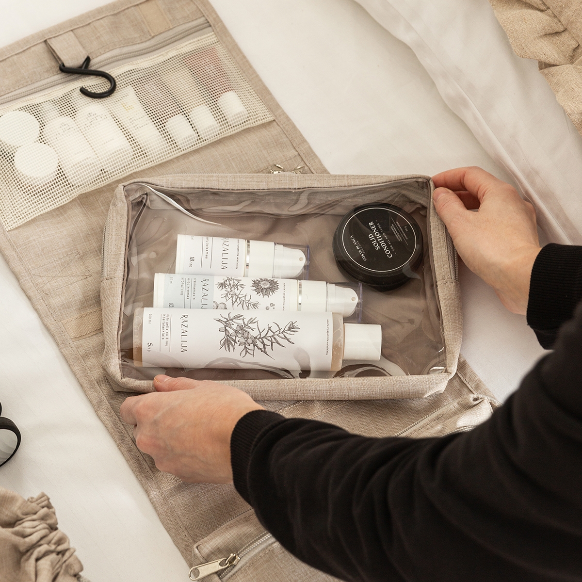 Toilettaske med masser af smarte funktioner. Her i den beige version. Hæng den op på en knage, når du ankommer til hotellet og hav fuldt overblik over dine toiletartikler. Aftagelig gennemsigtig plastikpose til security, mange forskellige rum og letvægtsmateriale er bare nogle af de mange praktiske funktioner i denne toilettaske fra Svenske Bigso Box.