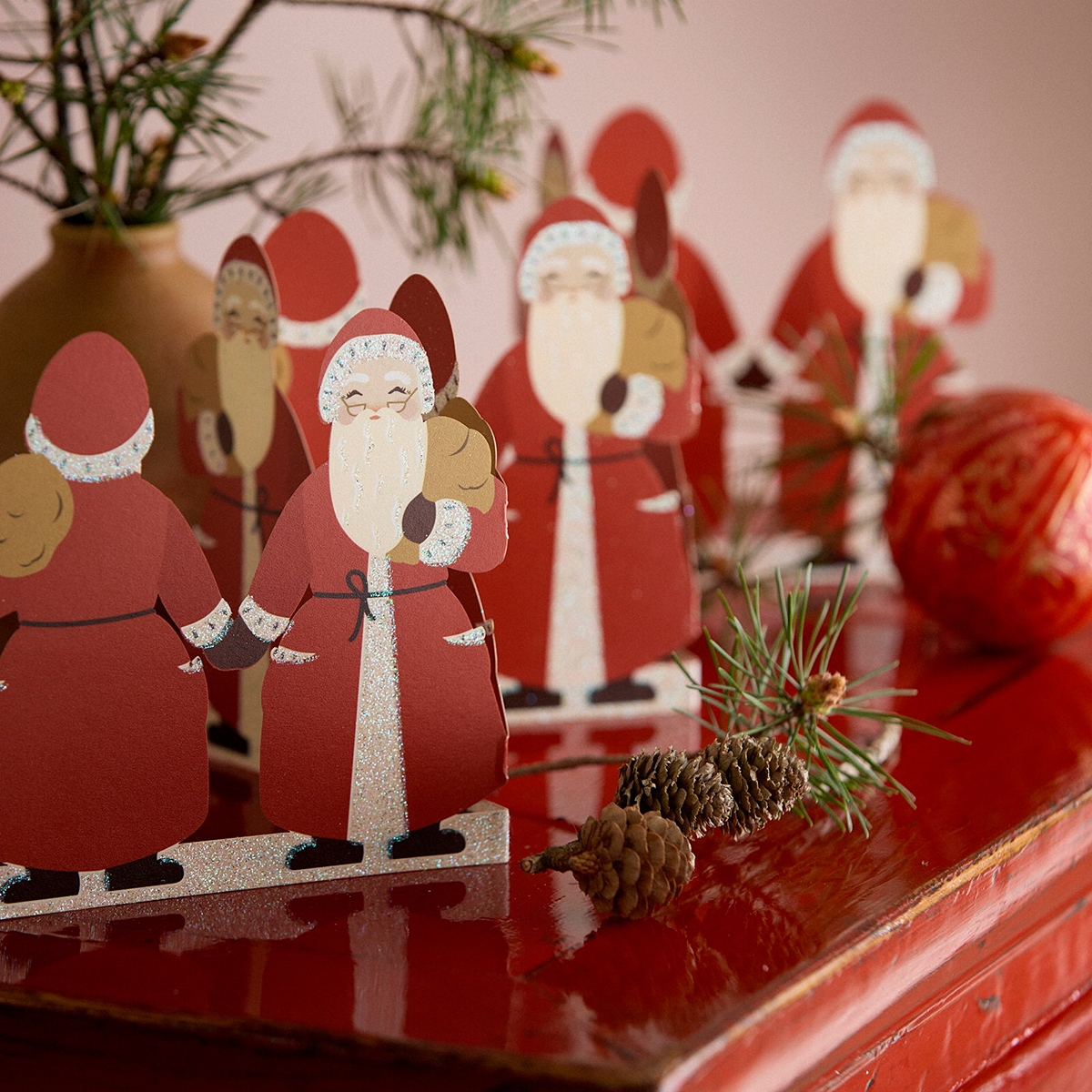 - Denne bordguirlande er lavet i papirudklip med julemænd i en flot ruby rød farve.