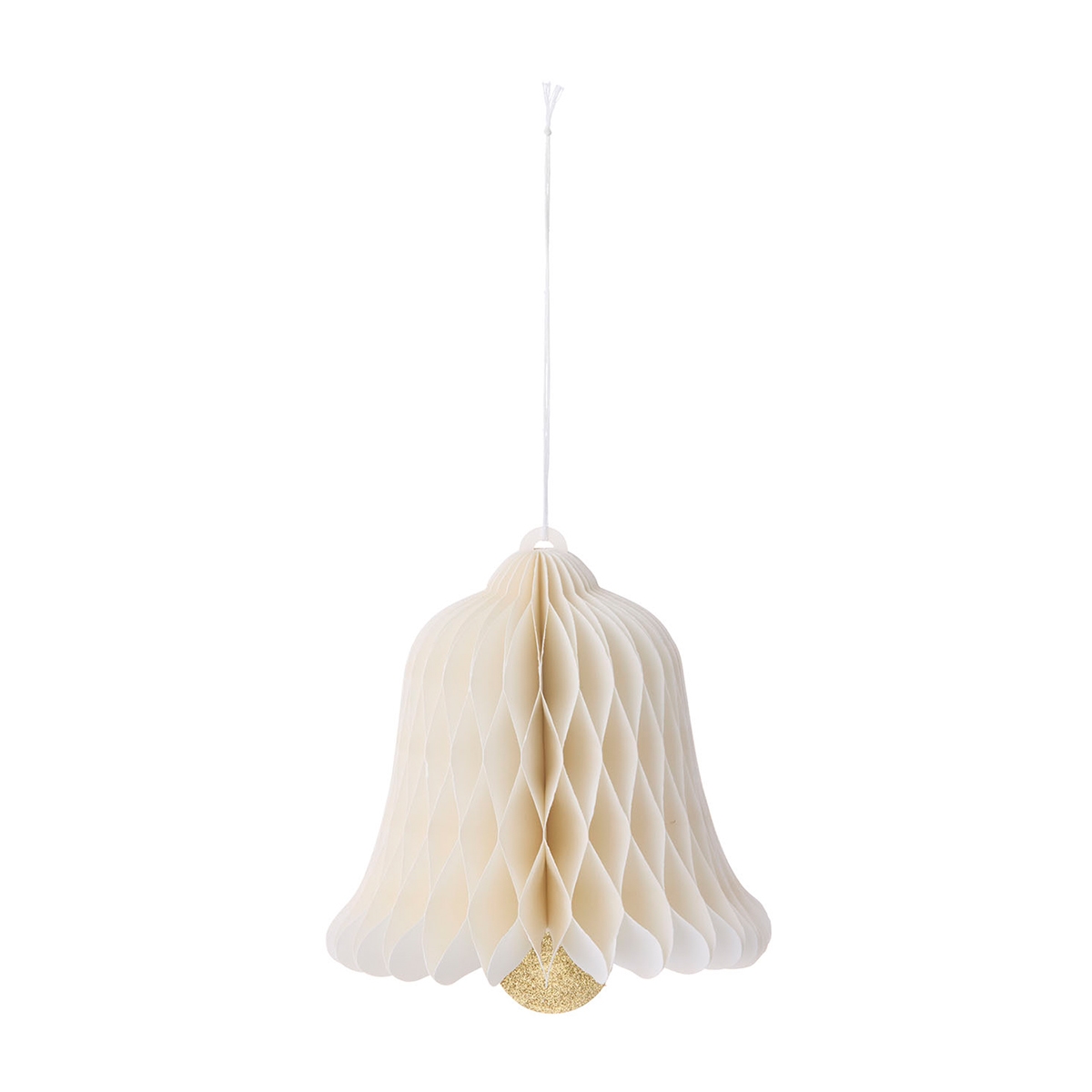 Ophæng udformet som en klokke i råhvidt honeycomb papir fra Bungalow. I råhvidt papir med gyldne glitterdetaljer