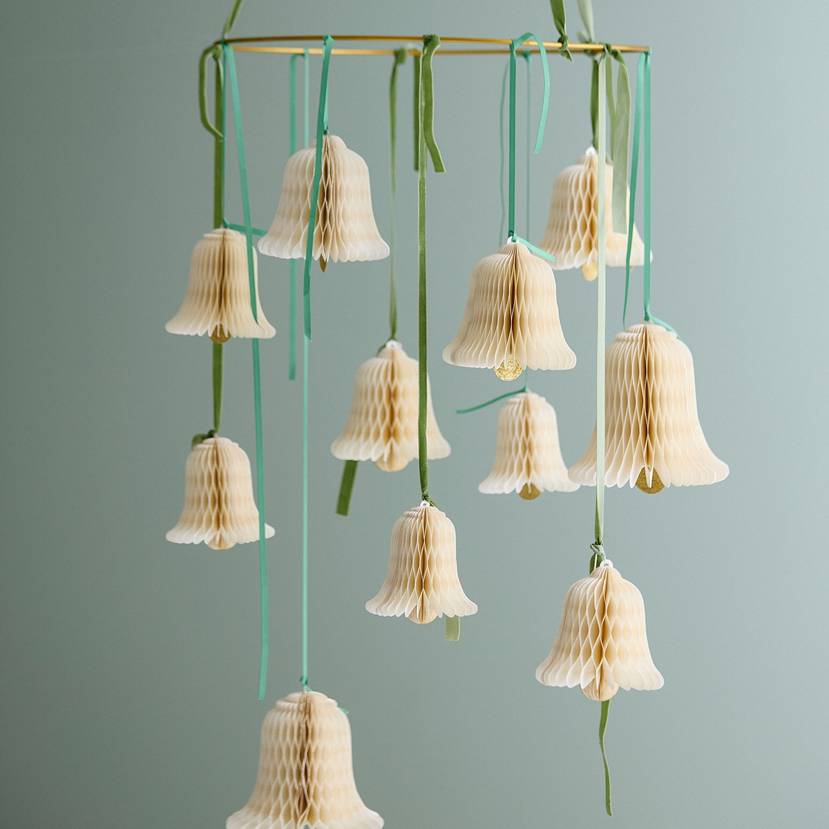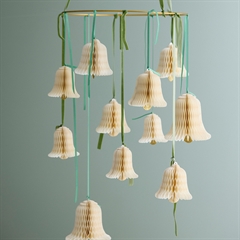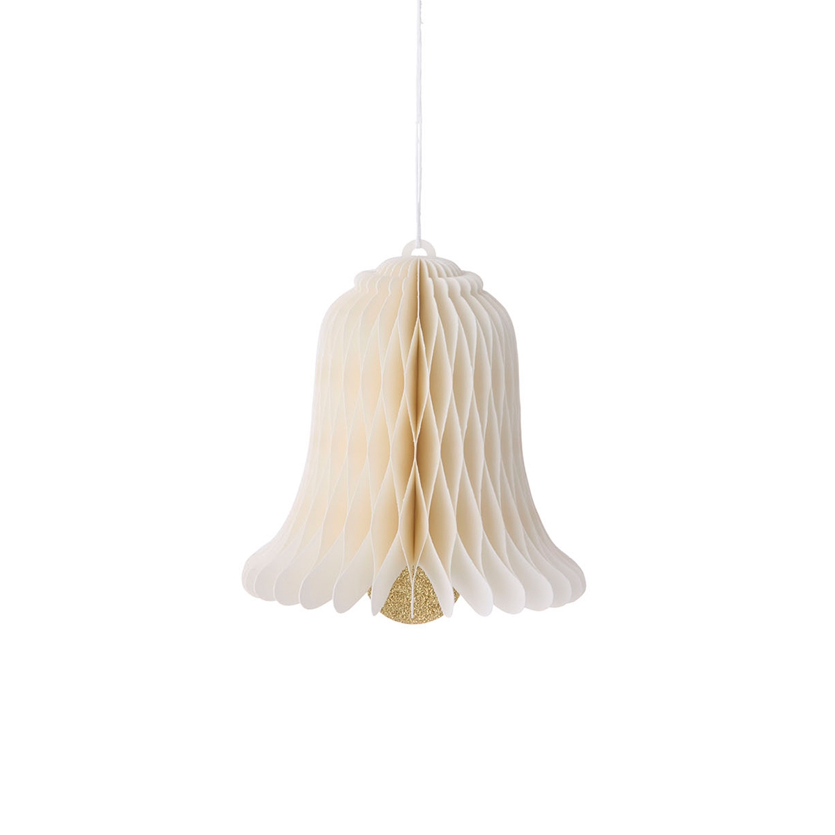 Ophæng udformet som en klokke i råhvidt honeycomb papir fra Bungalow. Med gyldne glitterdetaljer