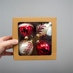 4 smukke julekugler i glas til dekoration i hjemmet eller på juletræet. Leveres i gaveæske.