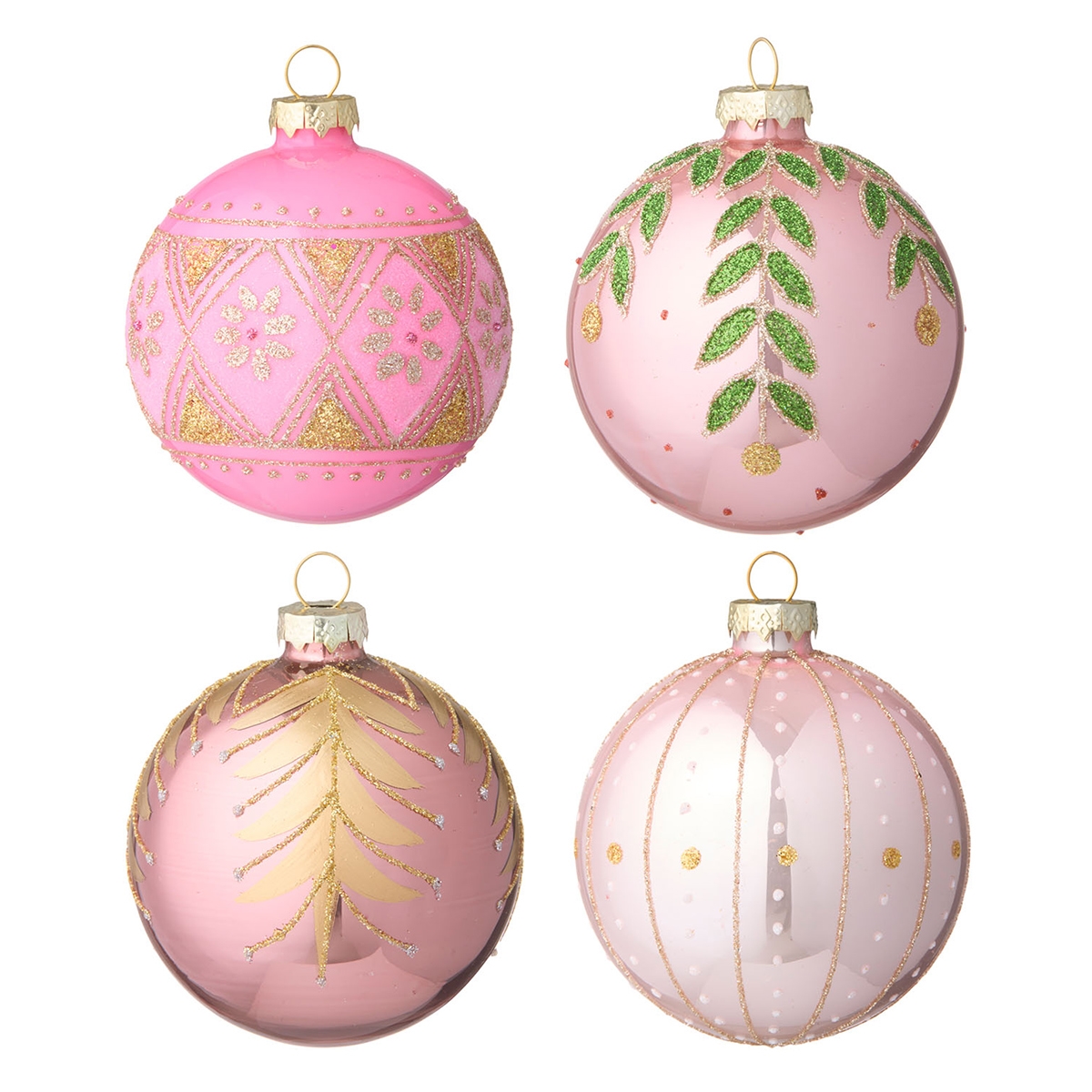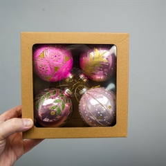 4 smukke julekugler i glas til dekoration i hjemmet eller på juletræet. Leveres i gaveæske.