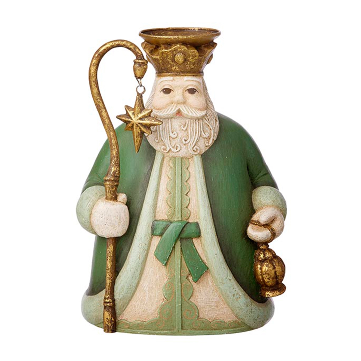 Figur fra Bungalow julekollektion af figurer i resin og metal. Denne forestiller en julemand i grønt outfit.