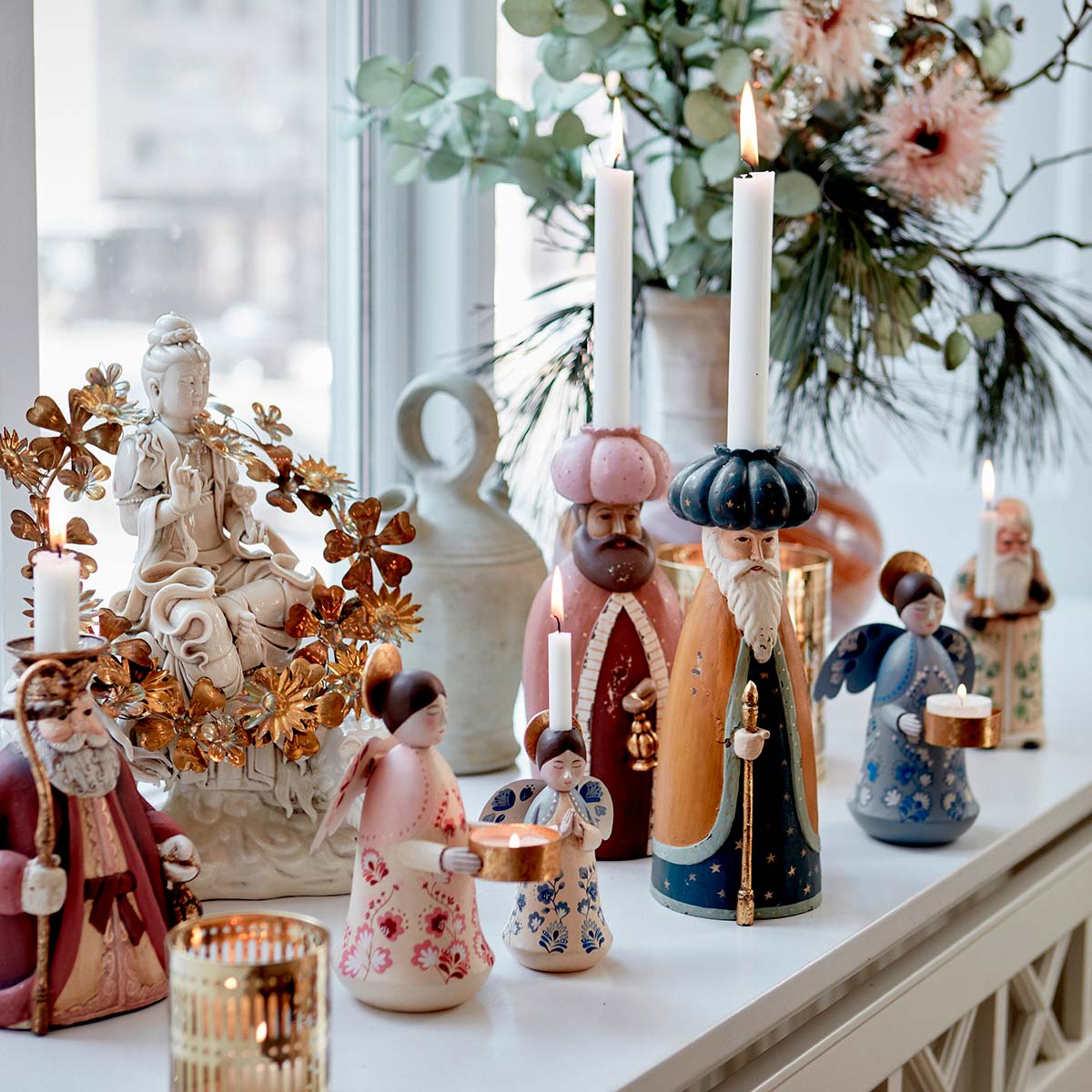 Lysestagerne er lavet i metal og resin og er sirligt malet i smukke farver og helt små detaljer.