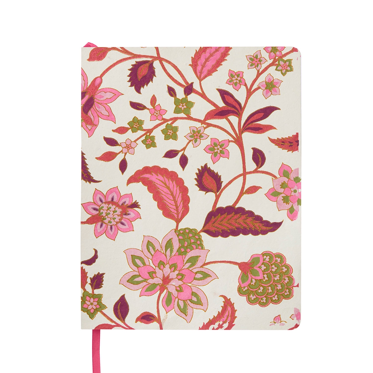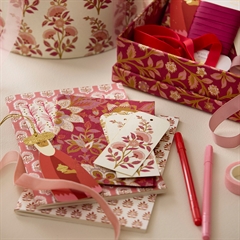 Eksklusiv notesblok fra Bungalow. Notesbogen er med cremefarvet tykt papir med blanke sider. Med silkebånd du kan bruge som bogmærke. Omslaget er dekoreret med skønne blomster fra fra Bungalows farveunivers og siden af papiret er lyserødt. Omslaget er kraftigt papir (ikke hardback)