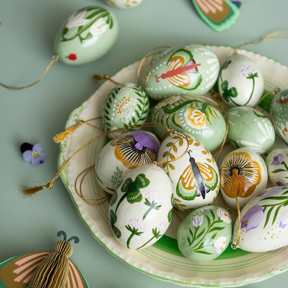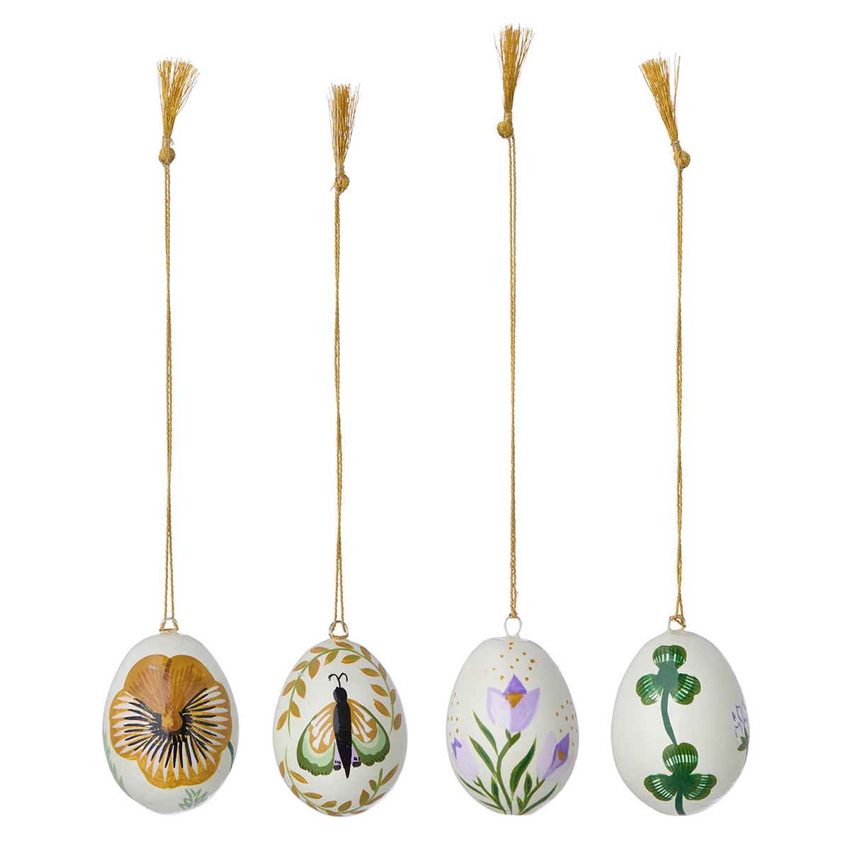 Bungalow påskeæg lavet i papmaché i designet Anila Shell .Påskeæg med sirligt håndmalede dekorationer af forårsblomster på en råhvid baggrund. Der er guldfarvet snor til ophæng. Påskeæg man har lyst til at have hængende hele foråret