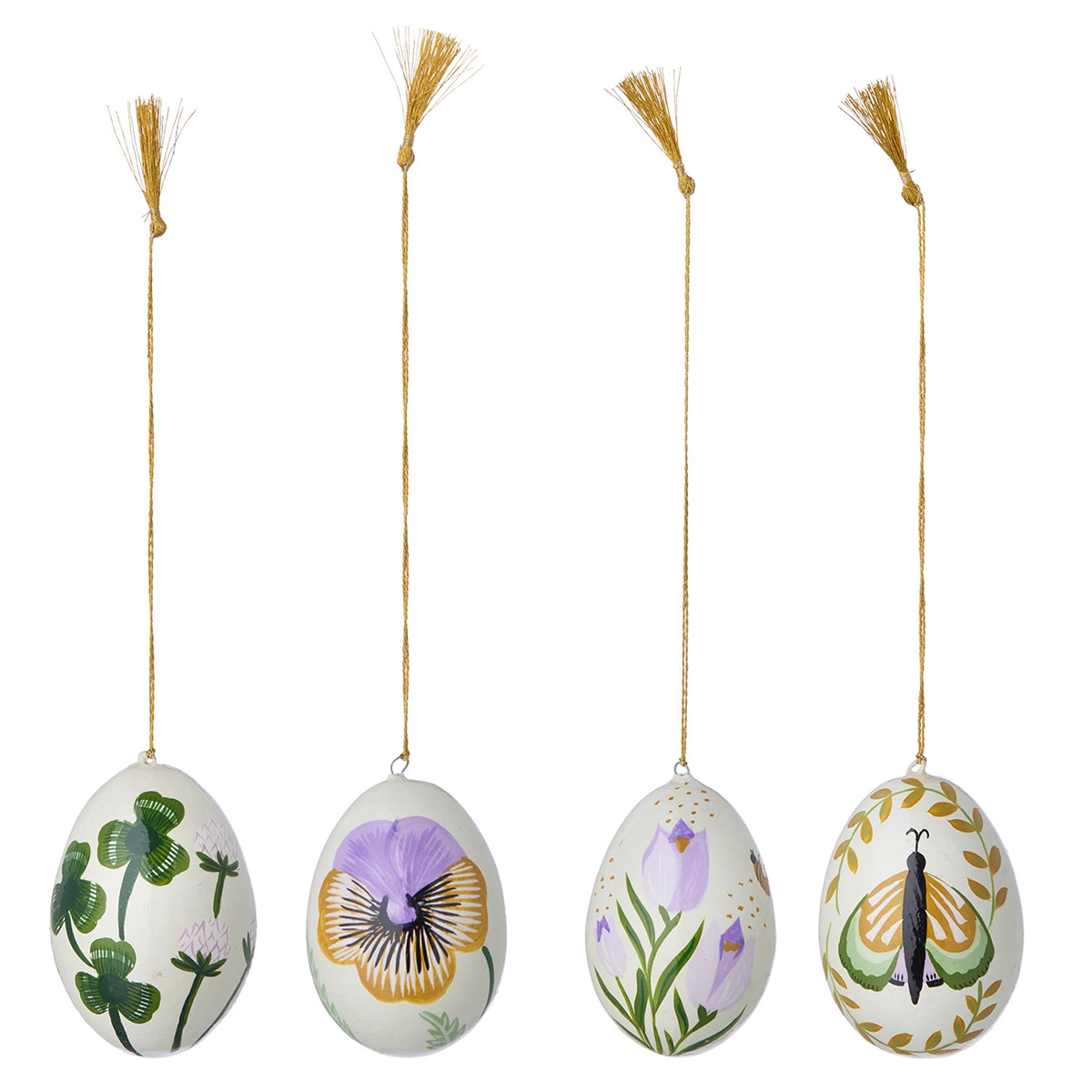 Bungalow påskeæg lavet i papmaché i designet Anila Shell .Påskeæg med sirligt håndmalede dekorationer af forårsblomster på en råhvid baggrund. Der er guldfarvet snor til ophæng. Påskeæg man har lyst til at have hængende hele foråret