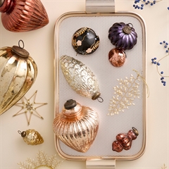 Håndlavet julepynt fra Bungalow lavet af glasperler og metal. Fra serien Clio Champagne der er en hel serie af sirligt dekoreret julepynt håndlavet i Indien af glasperler og metal. Denne forestiller en kvist med blade
