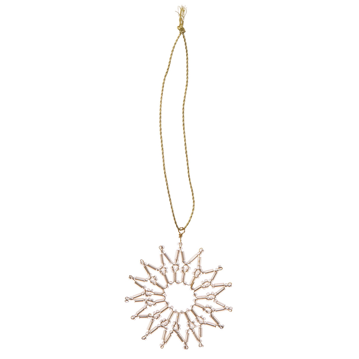Håndlavet julepynt fra Bungalow lavet af glasperler og metal. Denne forestiller et snefnug der glitrer i vintersolen. Del af en serie af perlepynt fra Bungalow