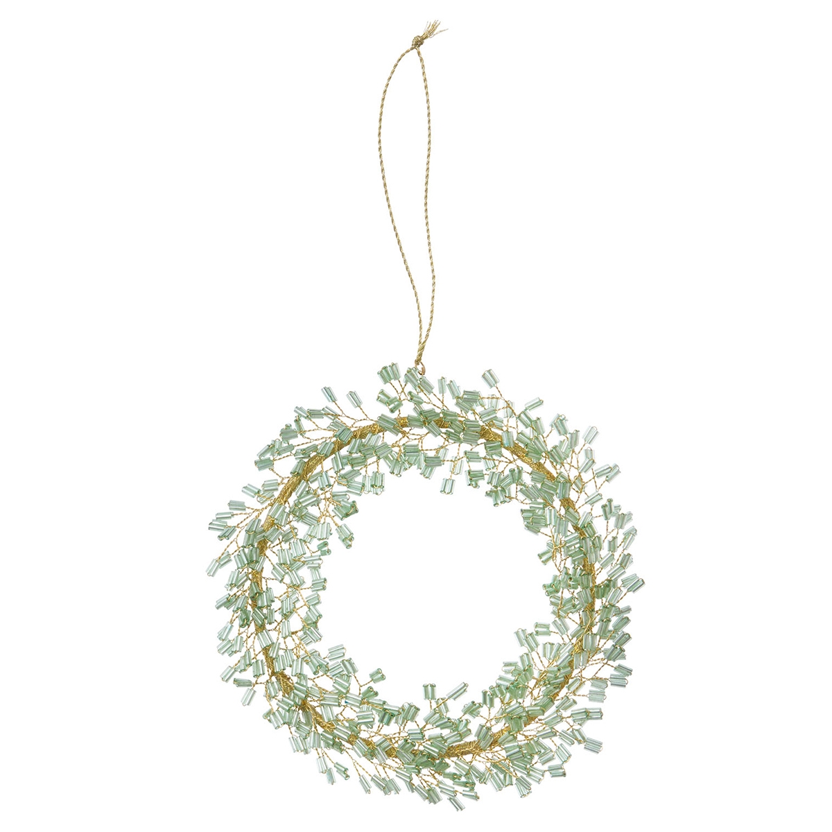 Håndlavet julepynt fra Bungalow lavet af glasperler og metal. Fra serien Jade der er en hel serie af sirligt dekoreret julepynt håndlavet i Indien af glasperler og metal. Denne forestiller en krans.