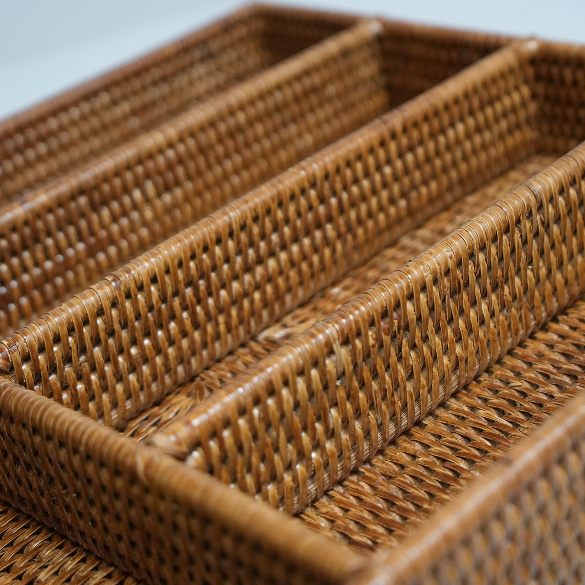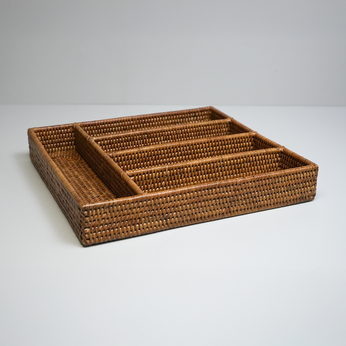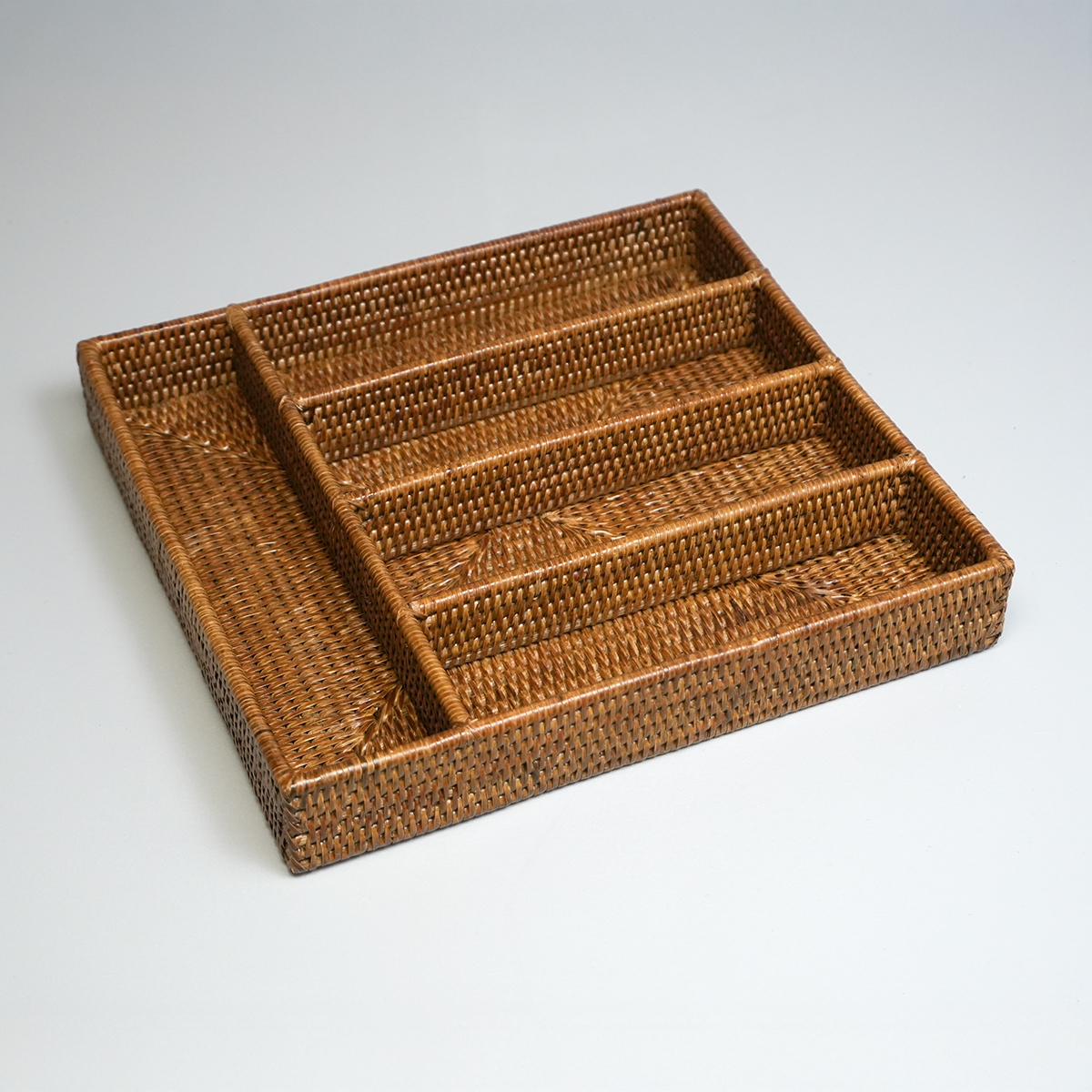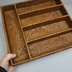 Bestikbakke i naturmaterialet rattan - her i den honningfarvede version. Lækker eksklusiv håndlavet bestikbakke med 5 rum.