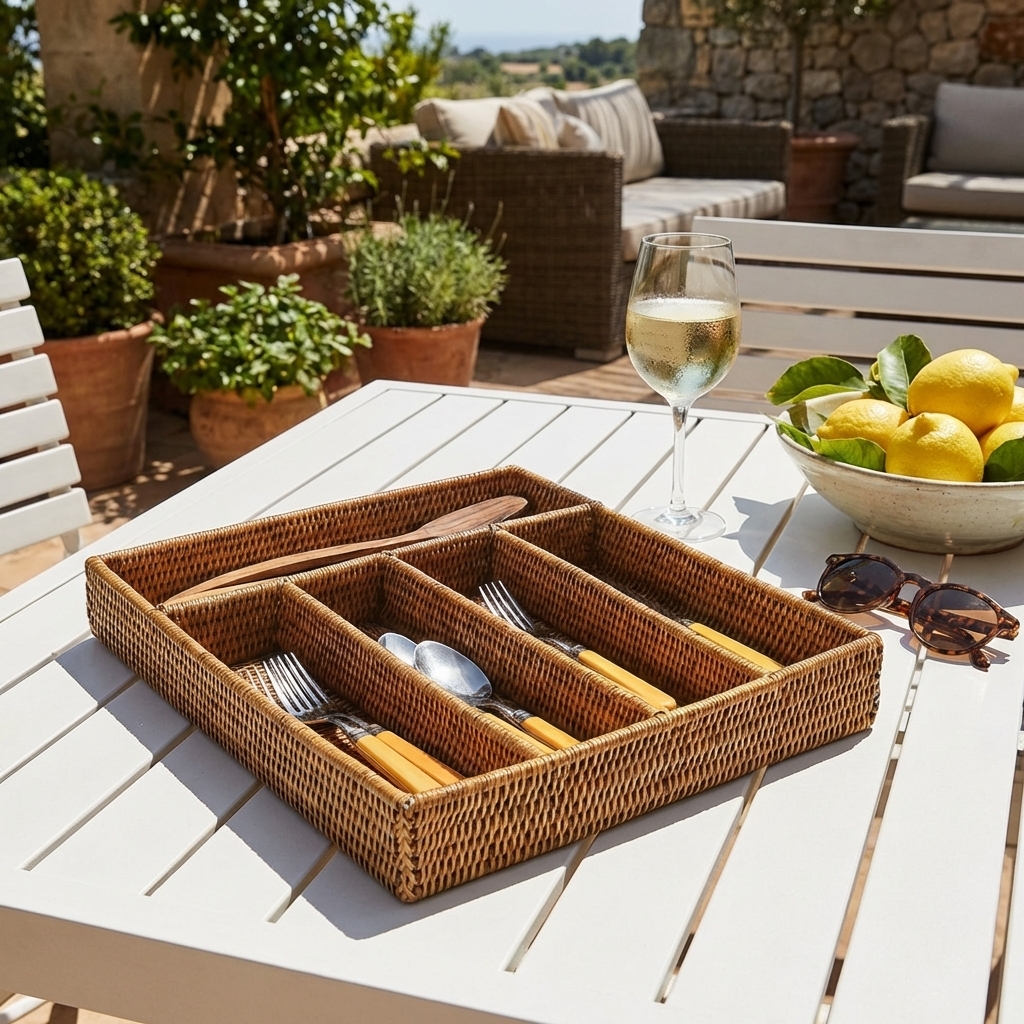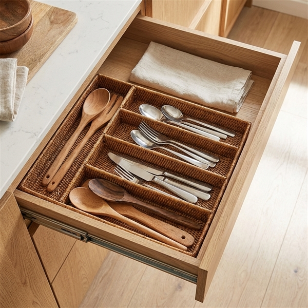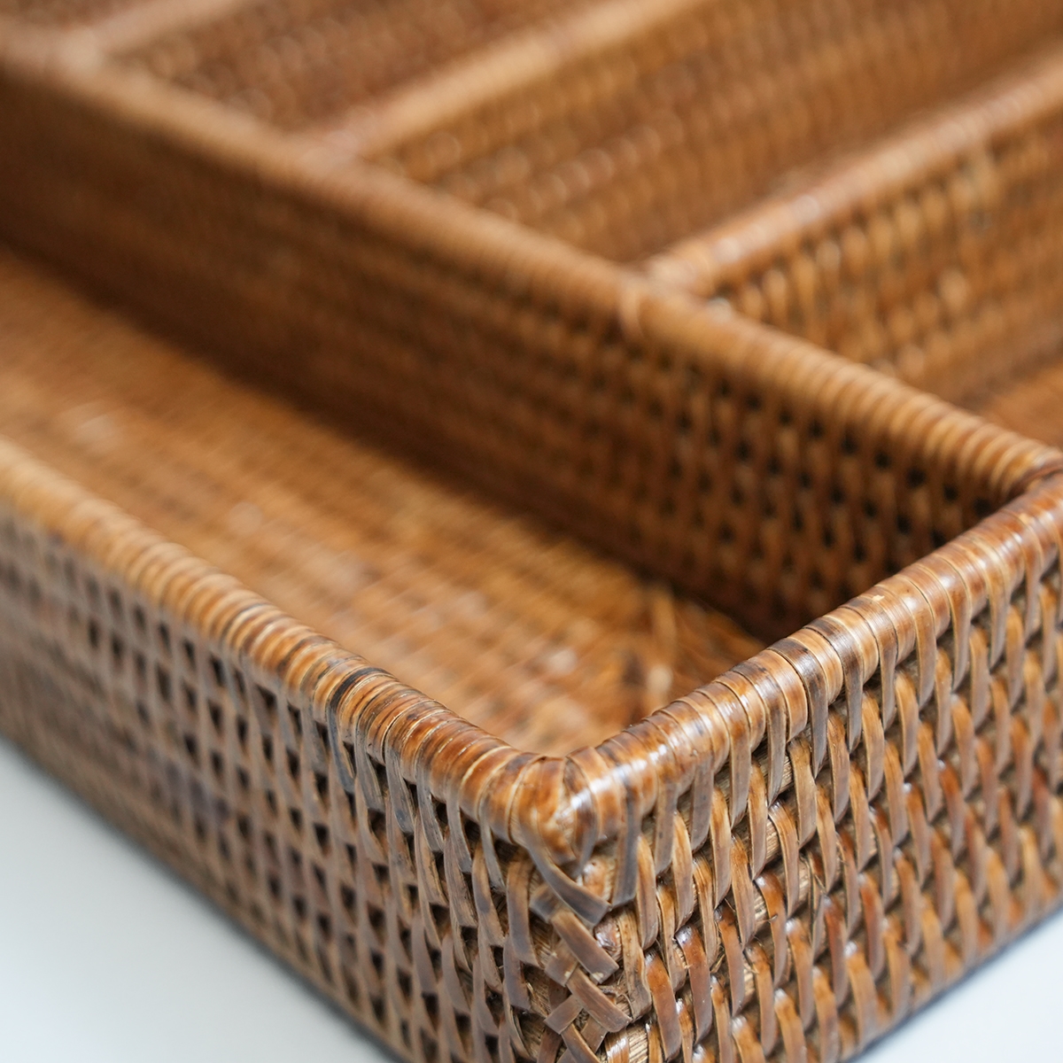 Bestikbakke i naturmaterialet rattan - her i den honningfarvede version. Lækker eksklusiv håndlavet bestikbakke med 5 rum.