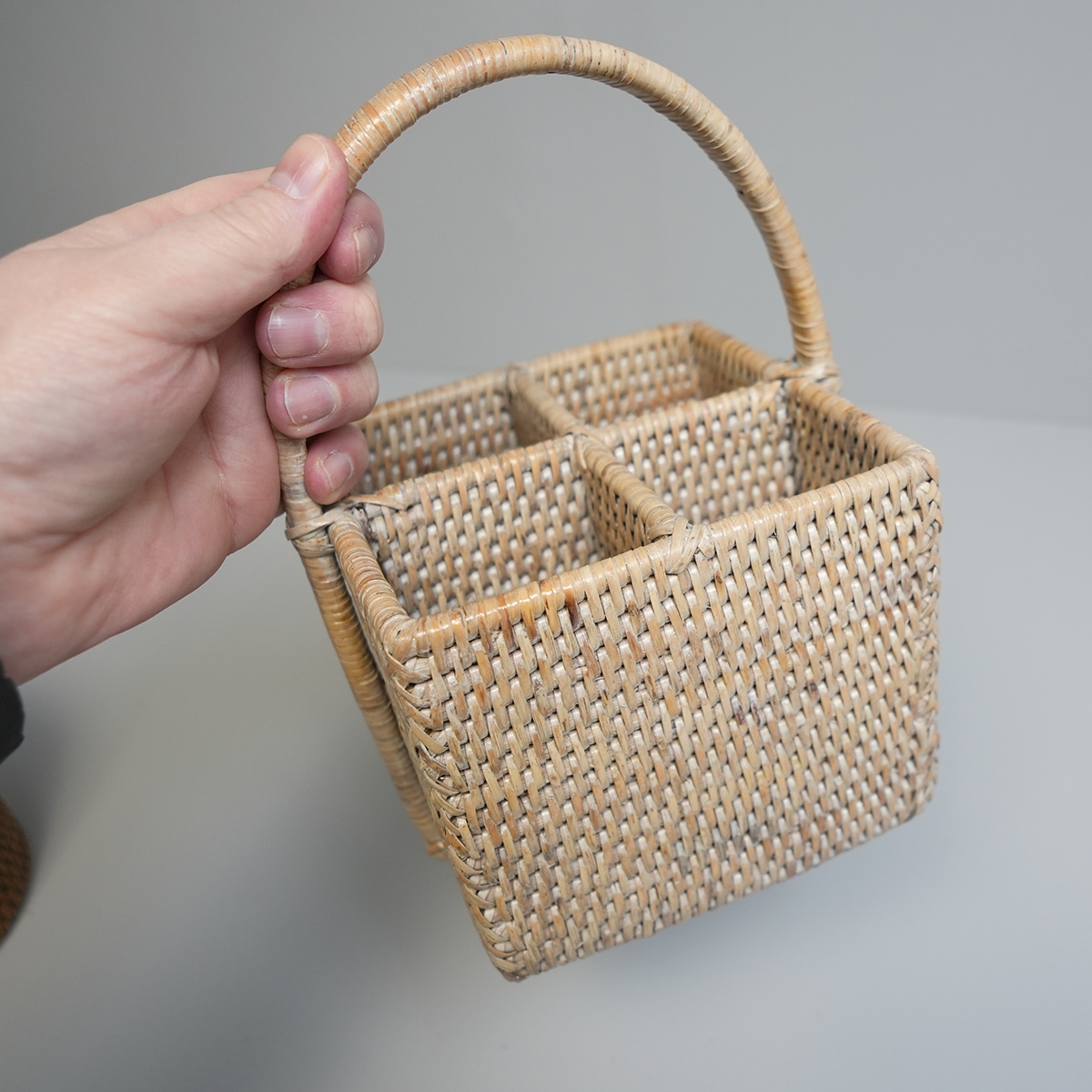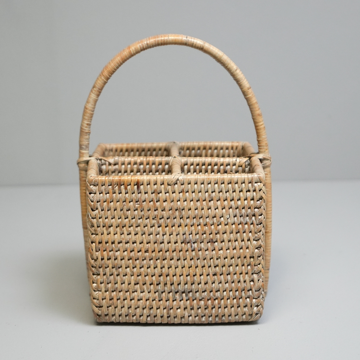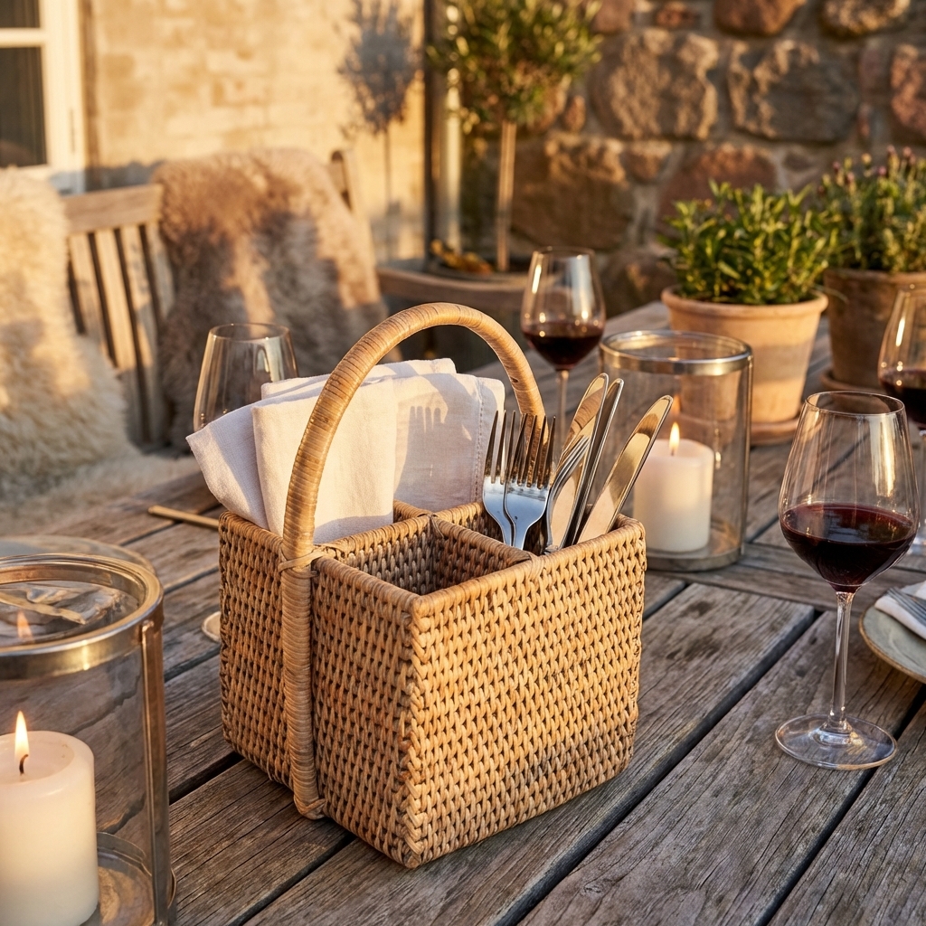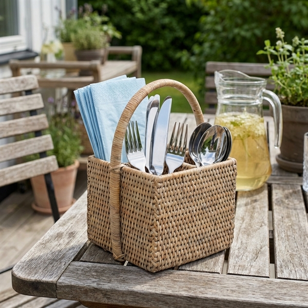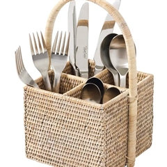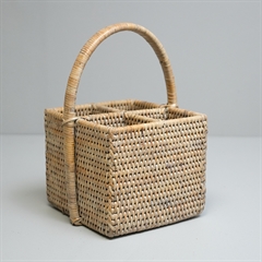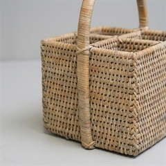 Bestikholder med fire rum, så du kan tage dit bestik med ud på terrassen med stil. Fire rum og håndtag og lavet i en fantastisk håndlavet kvalitet. Denne er lavet i hvidt rattan.