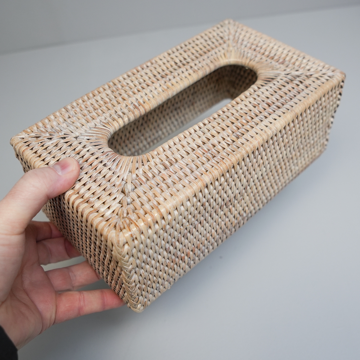 Holder til Kleenex pakker - den alm. rektangulære størrelse. Denne i den hvide version. Sæt holderen ned over din kleenexpakke og skjul den i det daglige med denne smukke holder lavet i naturmaterialet rattan. Håndlavet kvalitet der er så lækkert at røre ved og se på.
