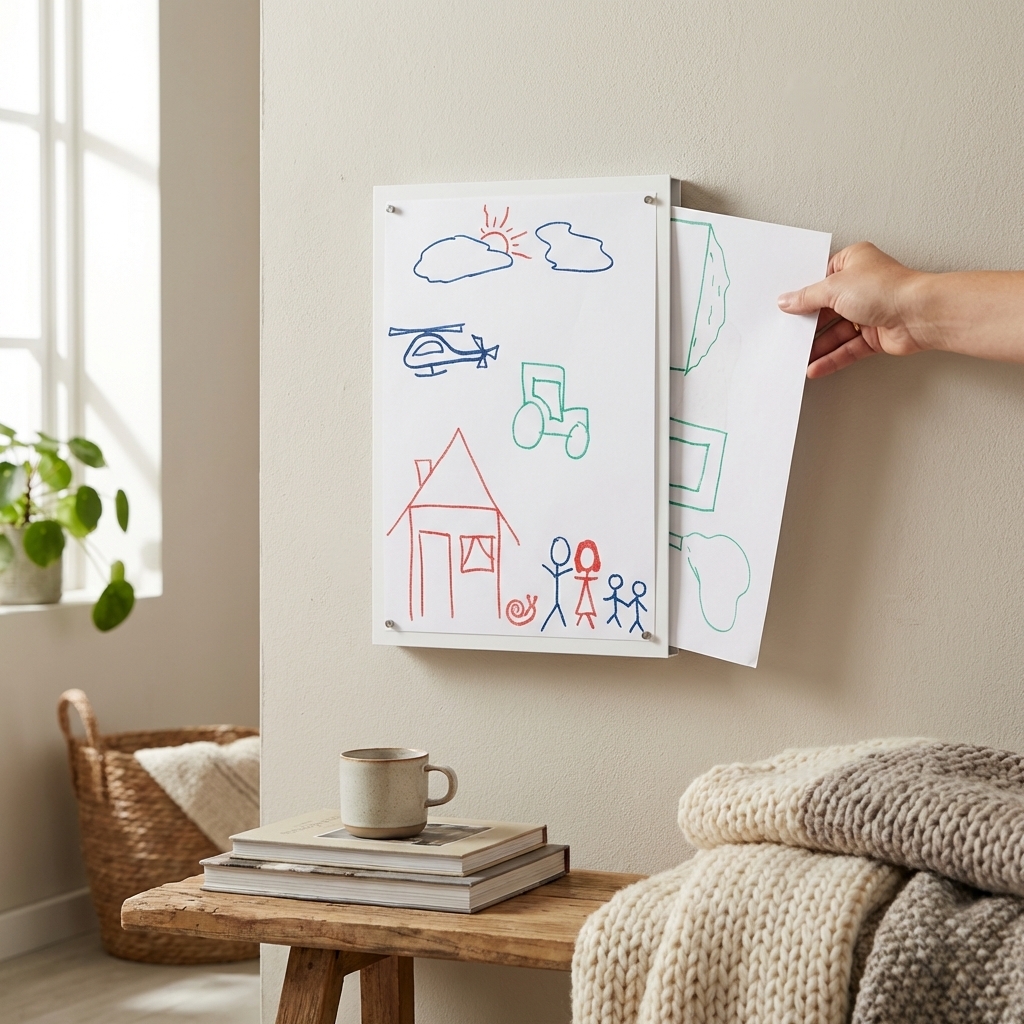 Sæt en tavle i stuen til børnenes tegninger. Når børnene kommer hjem med nye tegninger, bliver de skiftet ud og de gamle bliver opbevaret i rummet bag ved rammen.