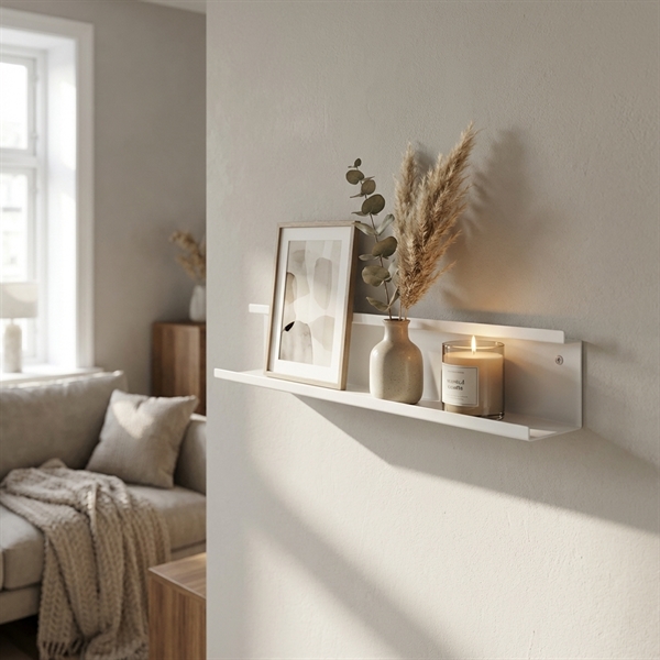 Brug den øverste hylde til billeder og rammer og den lidt dybere hylde foran til små pyntesager, lysestager eller parfumer og cremer.