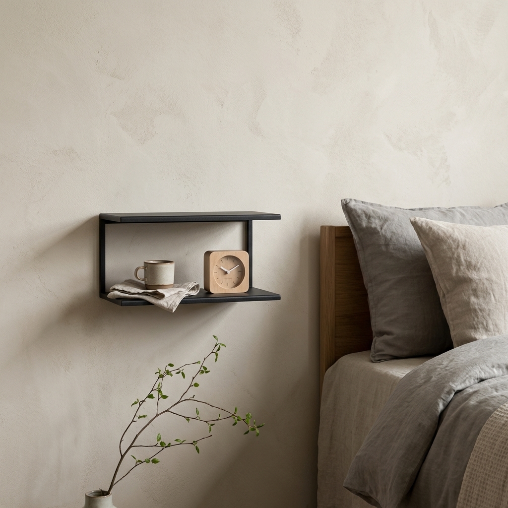 Minimalistisk og stilrent sengebord fra Como. Dobbelthylde der er perfekt i størrelsen som sengebord.