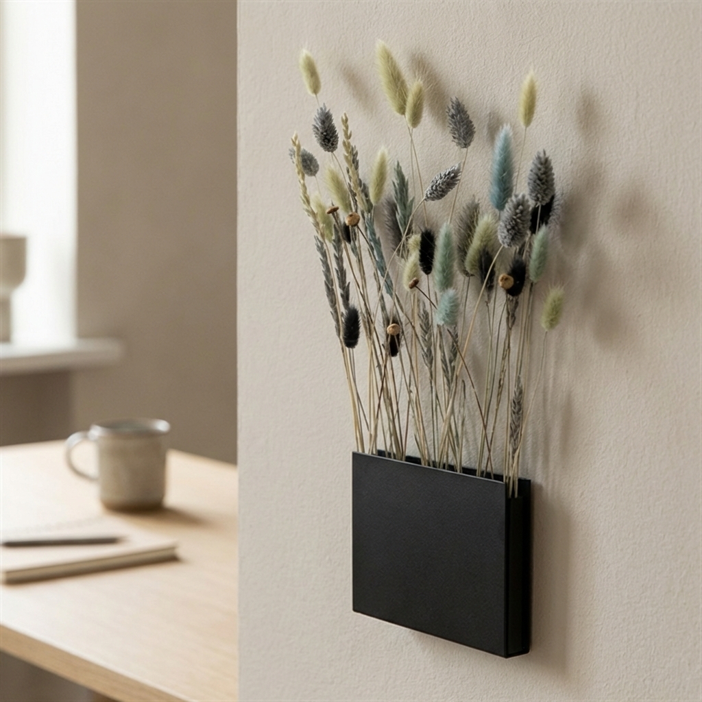 Den er beregnet til tørrede og kunstige blomster til dekoration på væggen.