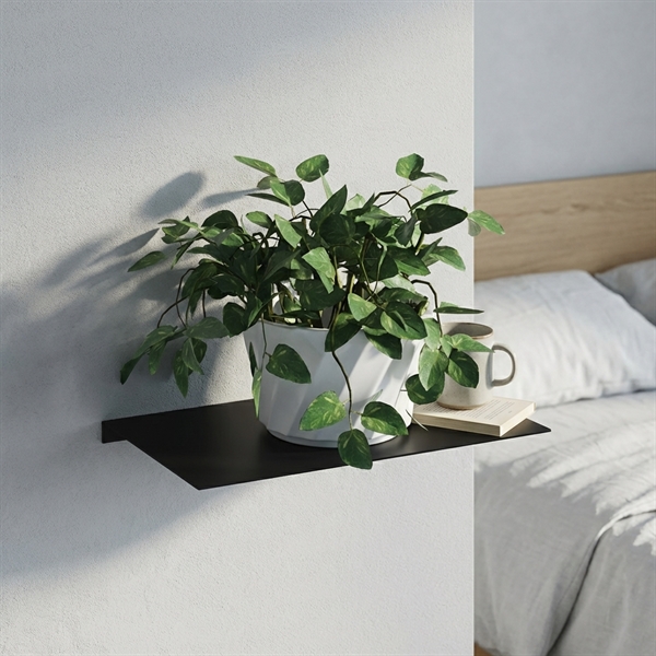 Væghylden er lavet i metal med en mat sort pulverlakering og måler 25 x 15 cm.