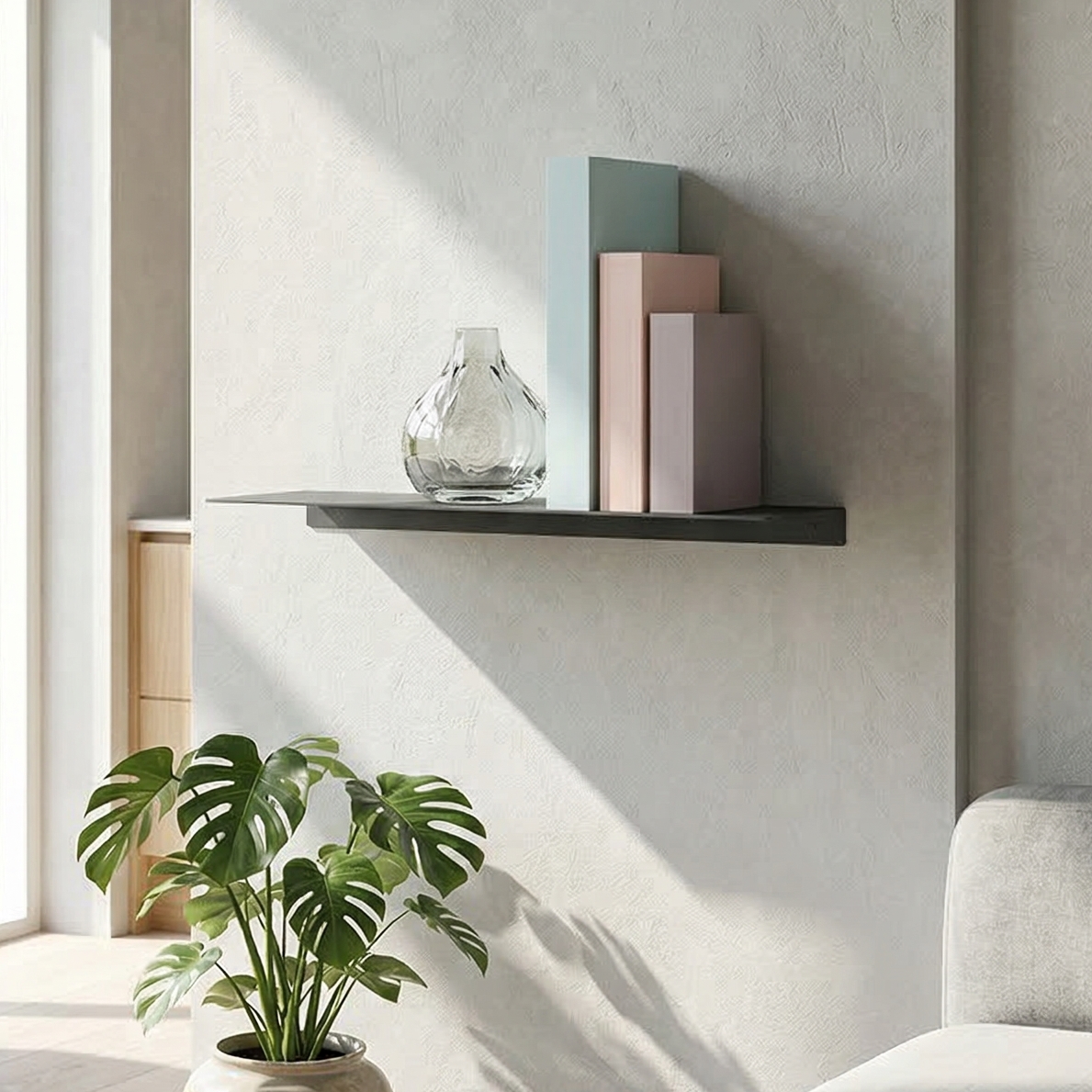 Væghylden er lavet i metal med en mat grå coating og måler 40 x 15 cm.