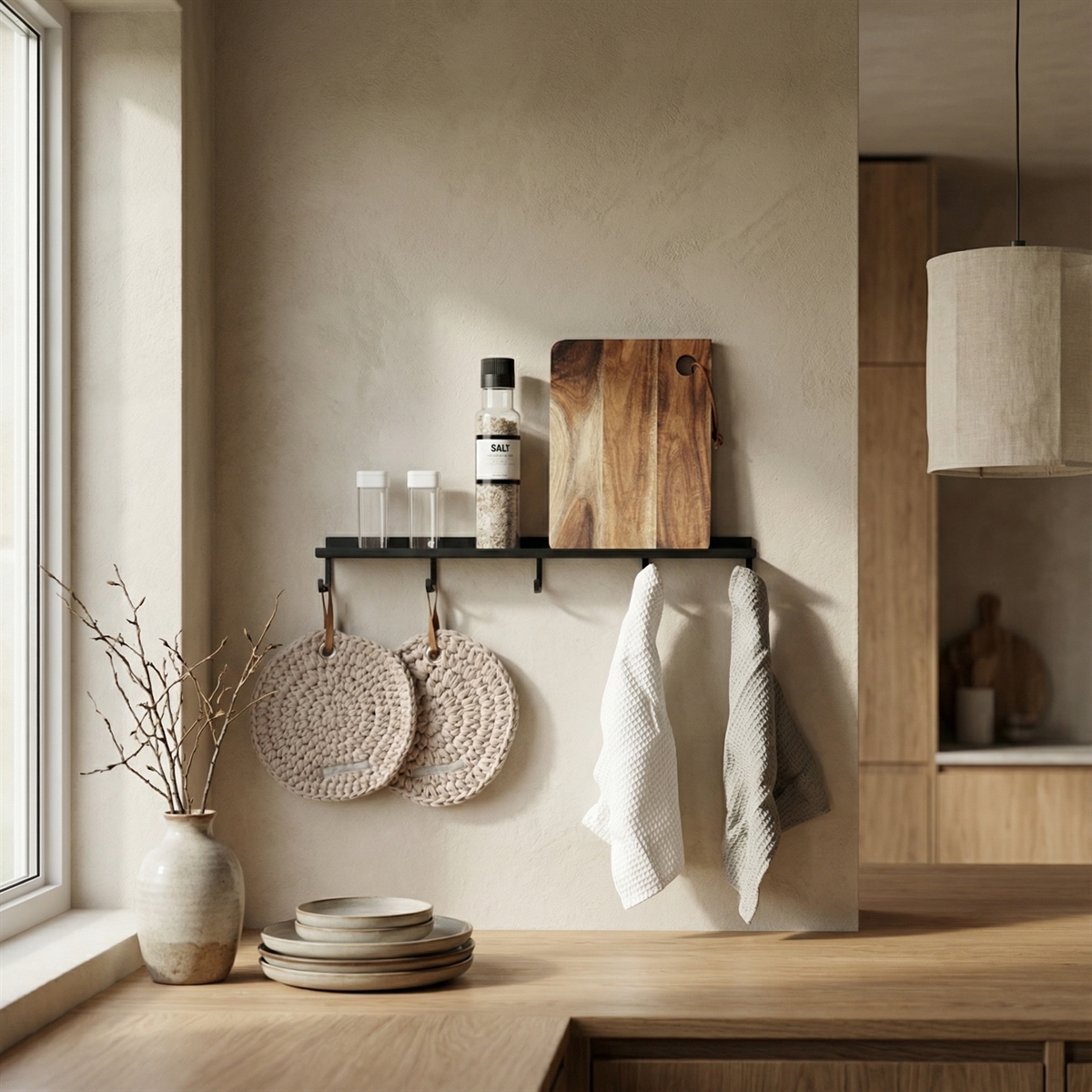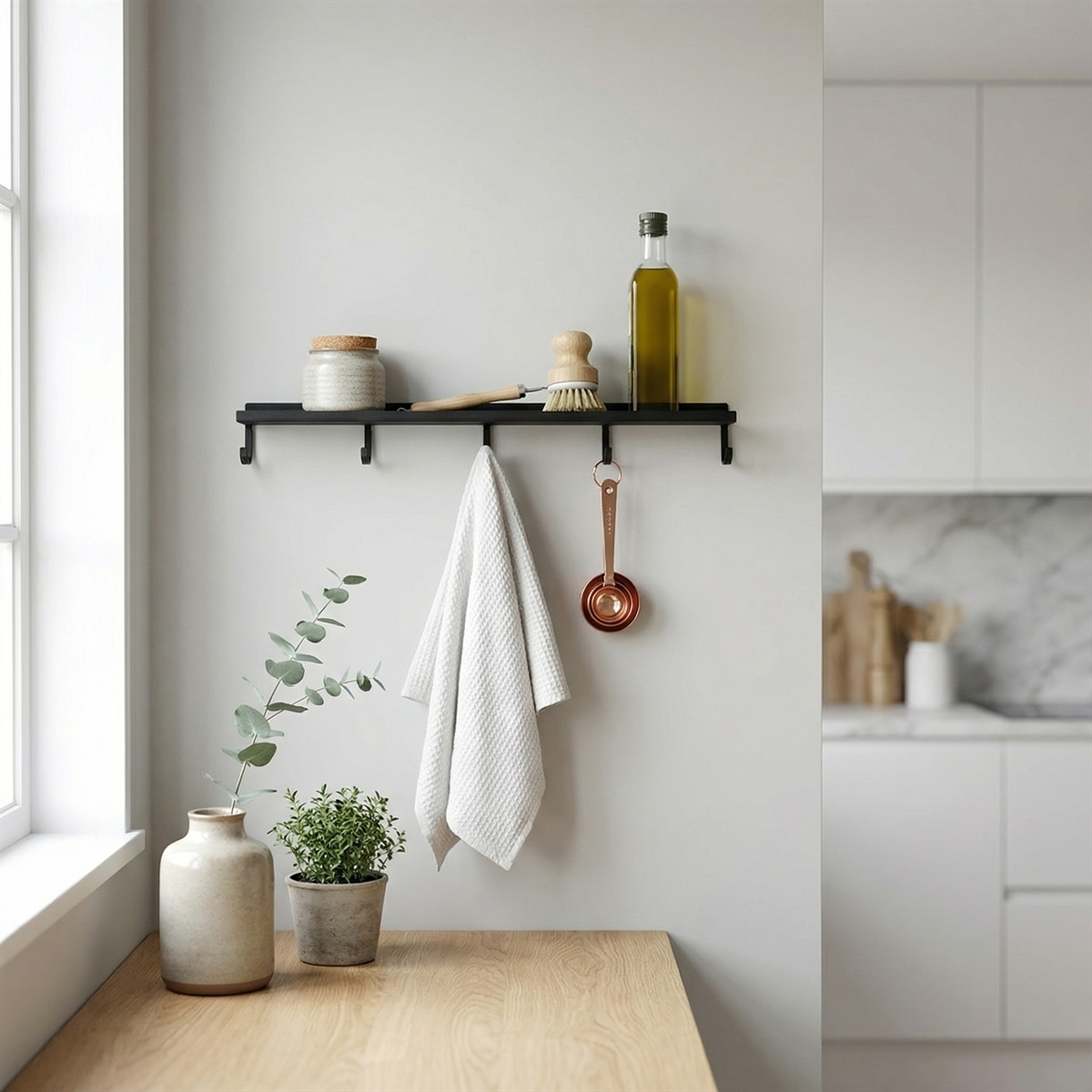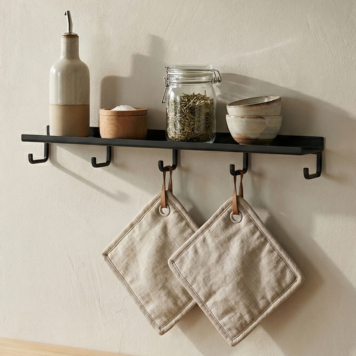 Stilren Como hylde med knager i metal. Denne er mat sort.