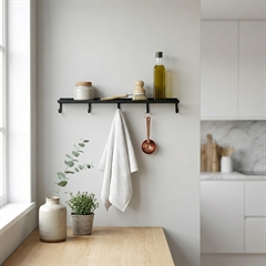 En lækker sort hylde med knager til jakker og frakker, nøgler, håndklæder, smykker og meget mere.