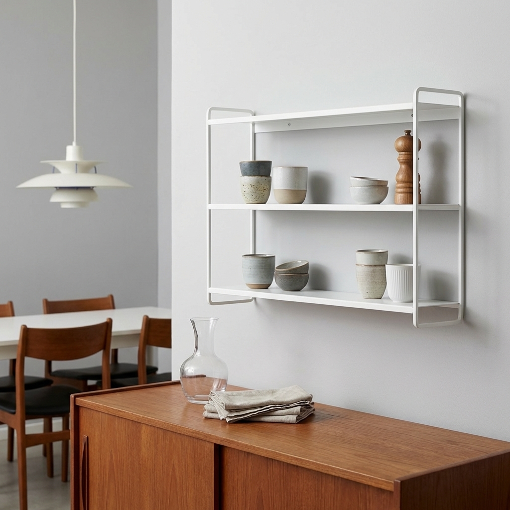 En stilren og klassisk hvid reol til ophæng på væggen.