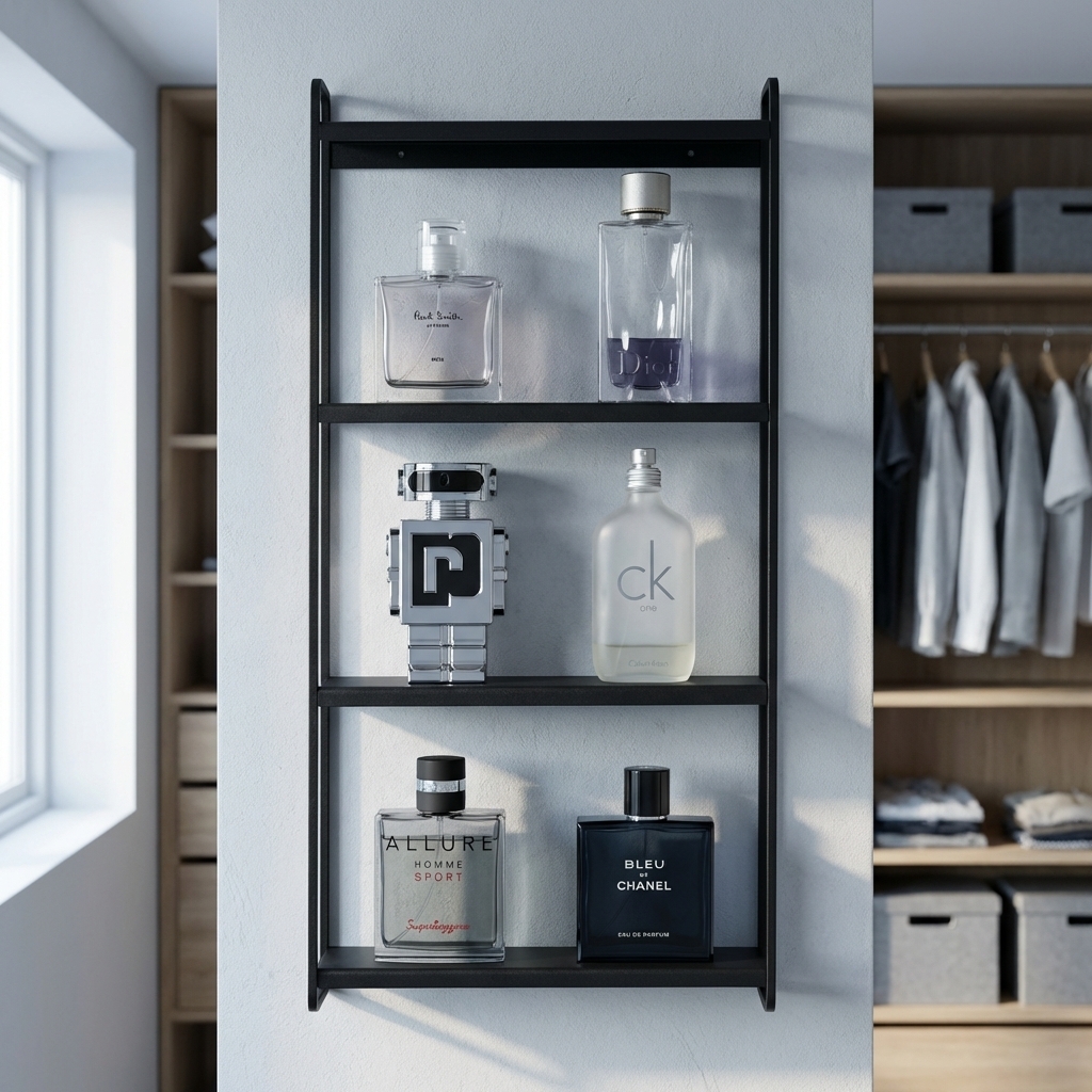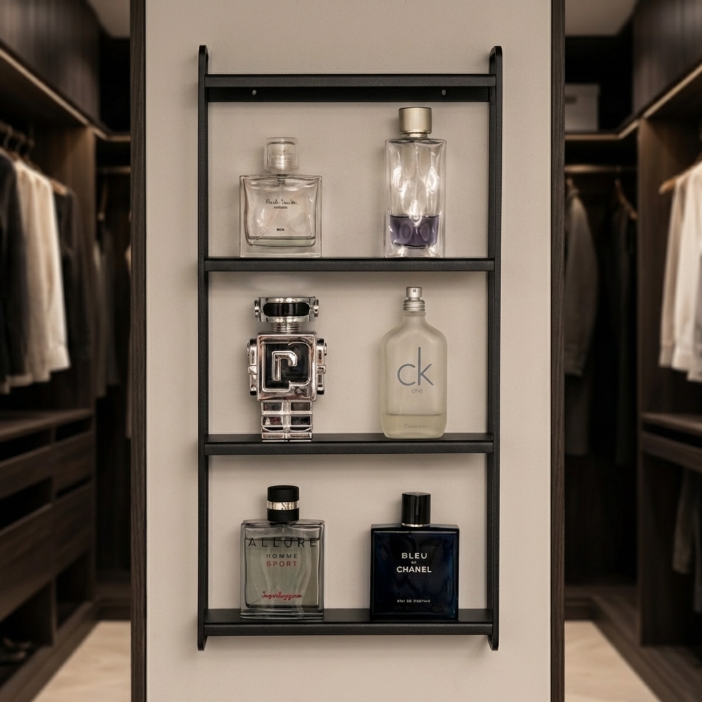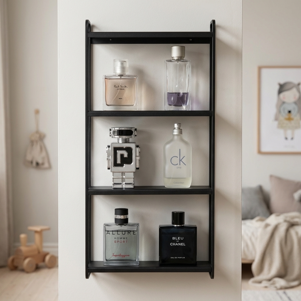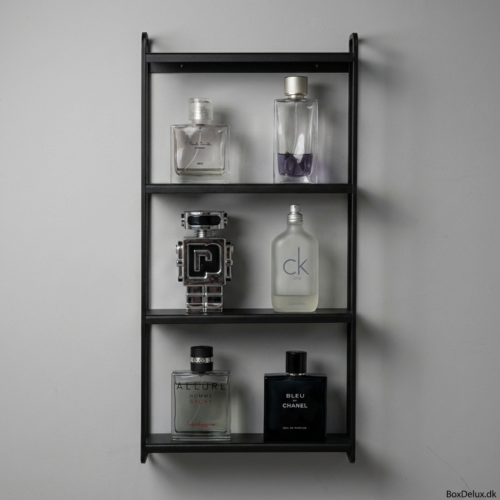 Parfumeholder til væg - elegant designparfume holder i dansk design til vægHylde til parfumeParfumehylde i sort metal