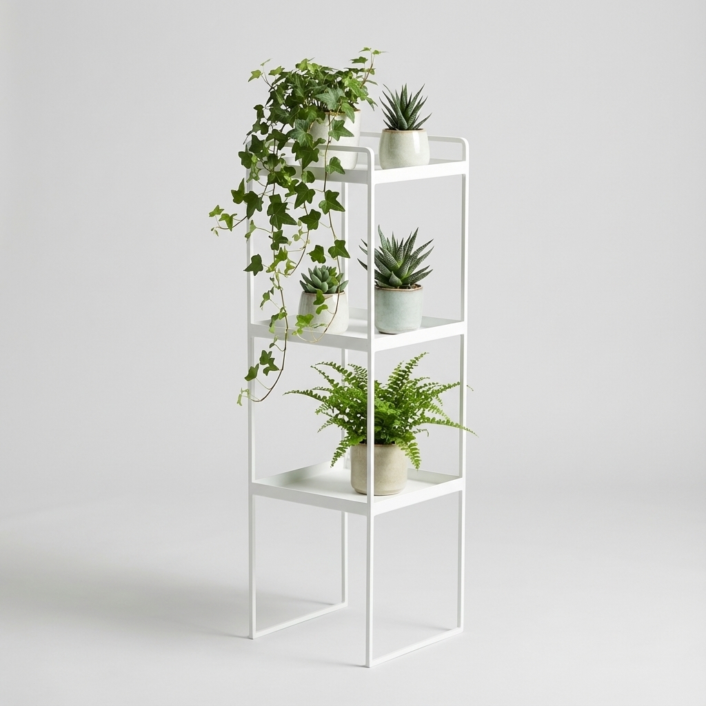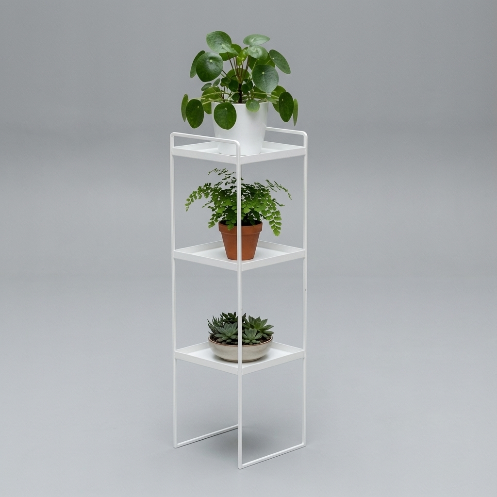 Det enkle og stilrene design gør at reolen passer ind i de fleste rum i hjemmet. Dette er modellen med tre hylder i alt. Reolen er lavet i metal der har fået en hvid pulverlakering.