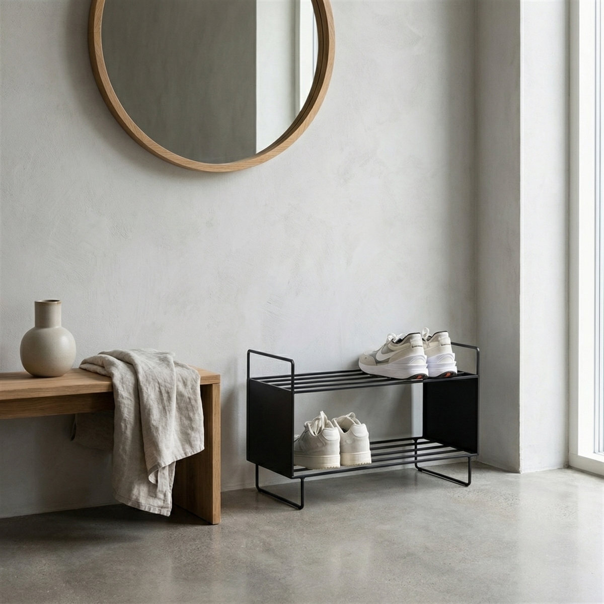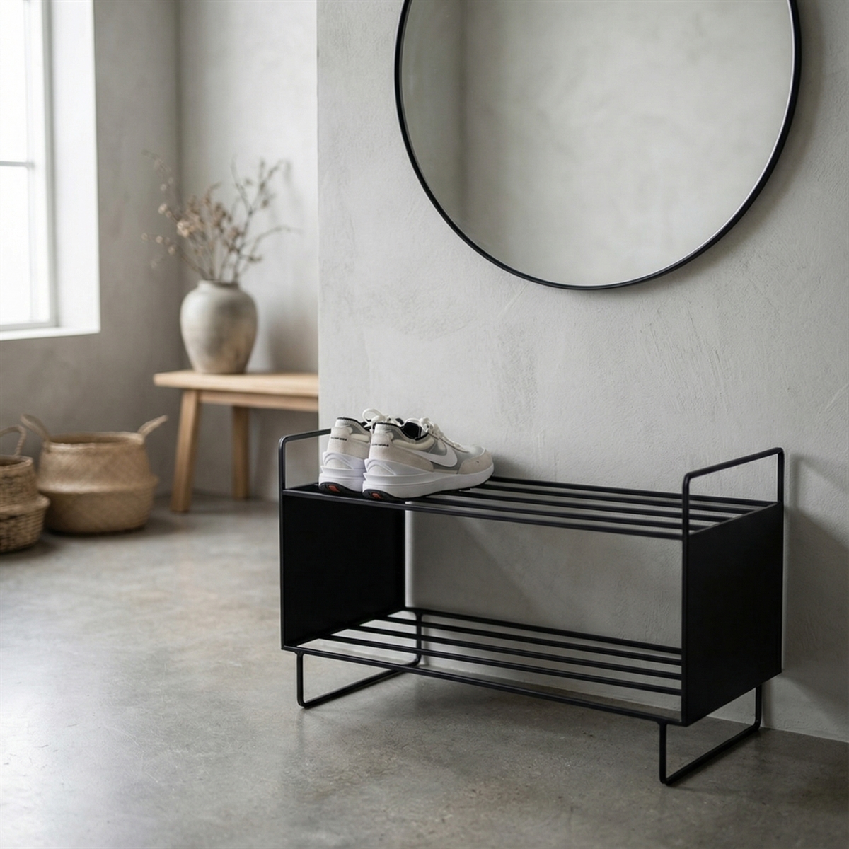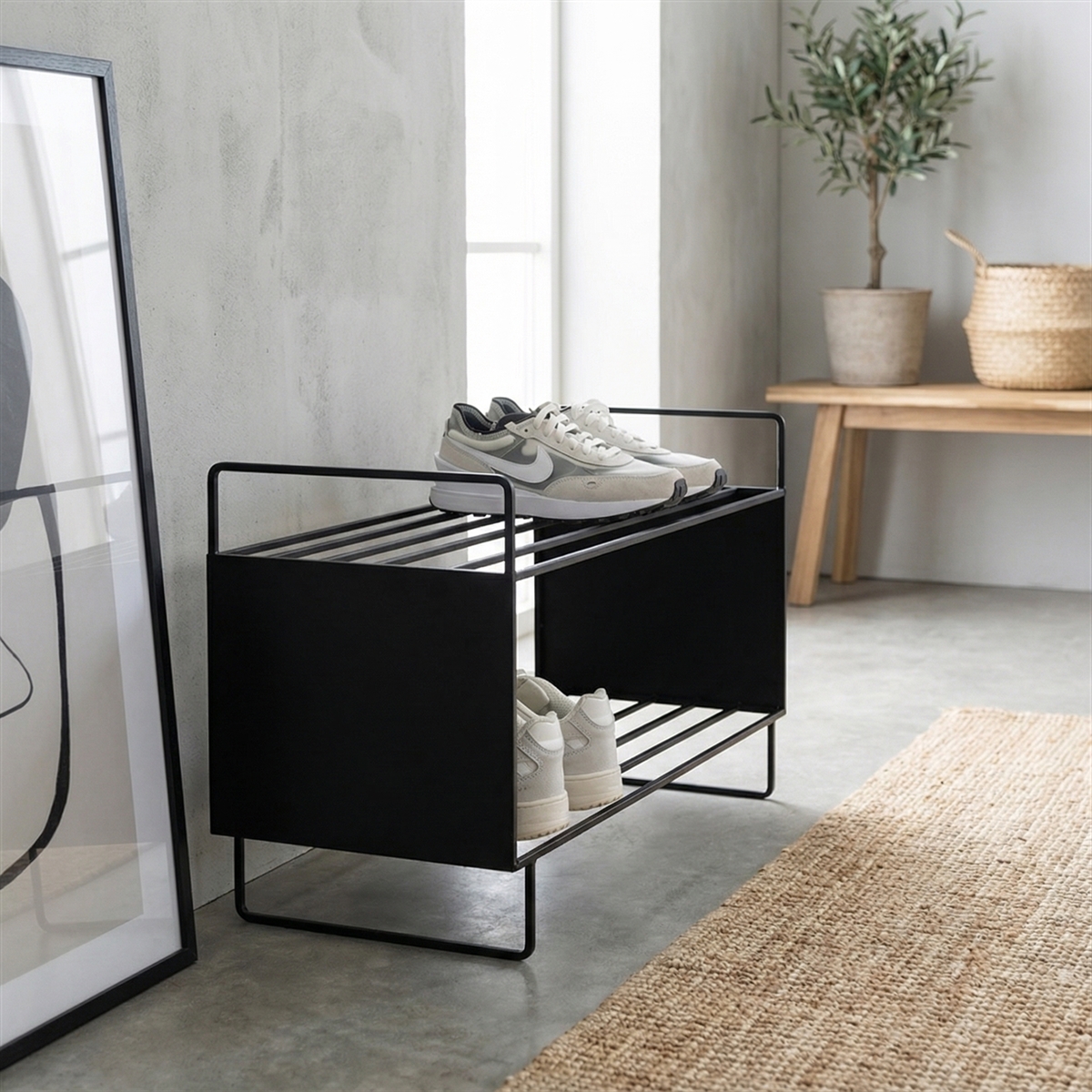 Skoreol i metal fra vores serie Como. Skoreolen er en klassisk og stilren skoreol til entréen. Der kan være 4-6 par sko i den fordelt på 2 hylder. Fremstillet af pulverlakeret metal - her i den sorte model.