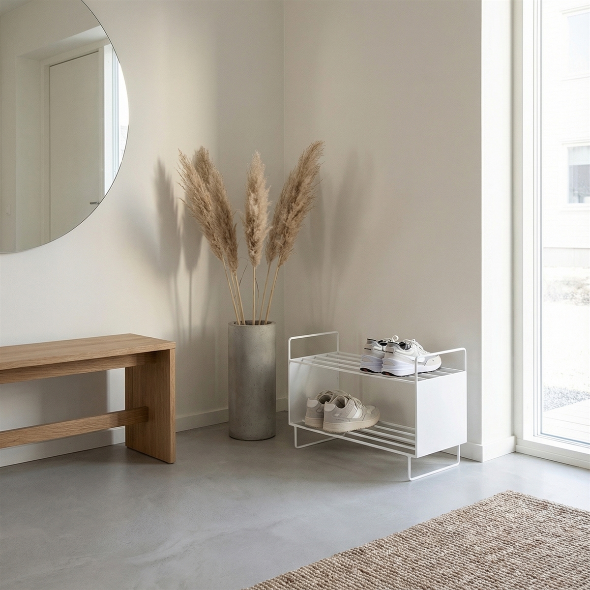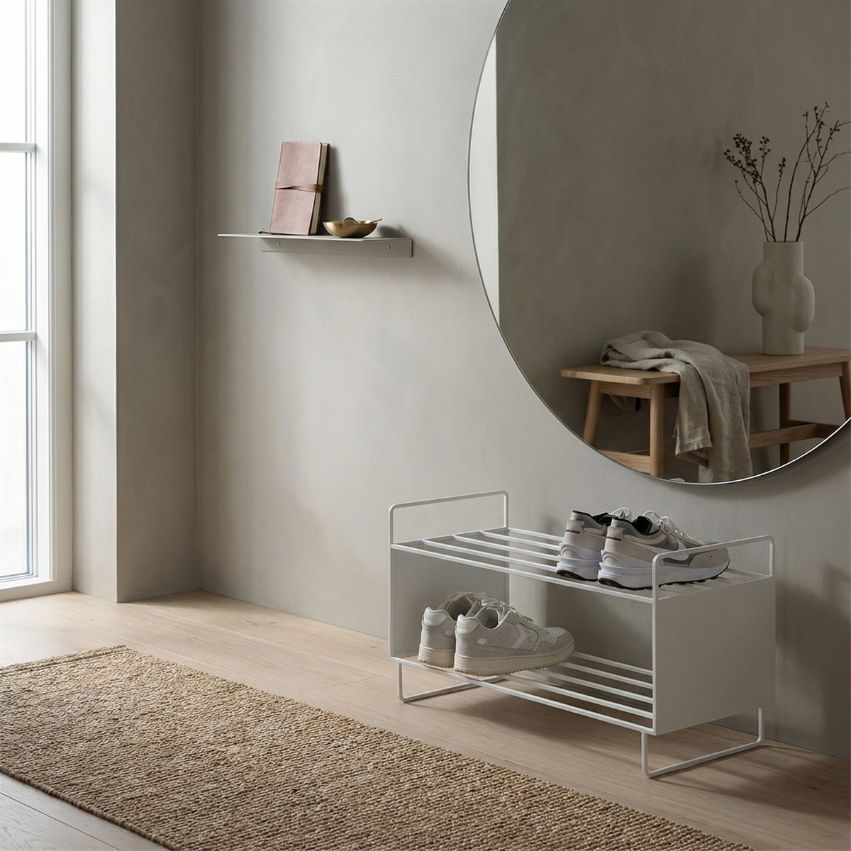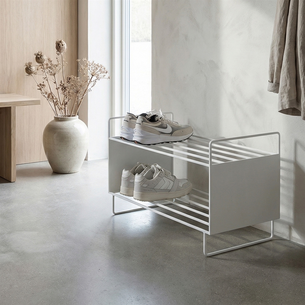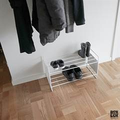 Skoreol i metal fra vores serie Como. Skoreolen er en klassisk og stilren skoreol til entréen. Der kan være 4-6 par sko i den fordelt på 2 hylder. Fremstillet af pulverlakeret metal - her i den hvide model.