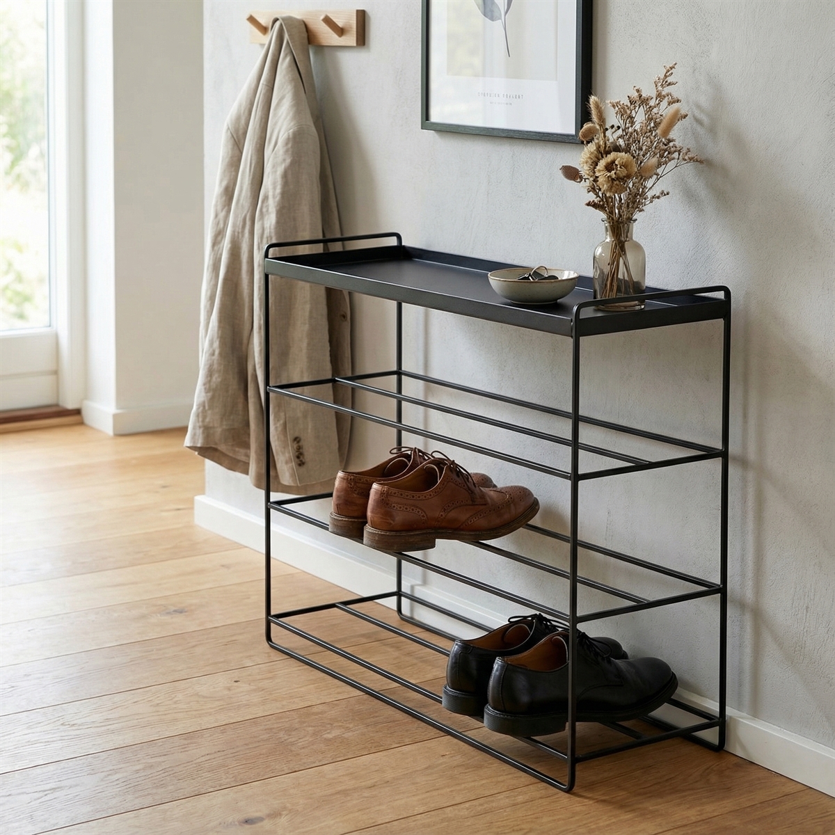 Sort skoreol i metal med 3 hylder, fra vores serie Como.