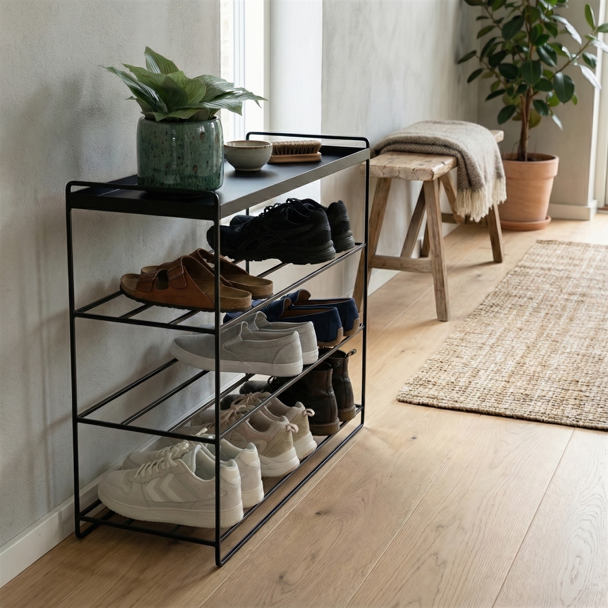 Klassisk og stilren skoreol til entréen, med en topplade øverst på reolen.