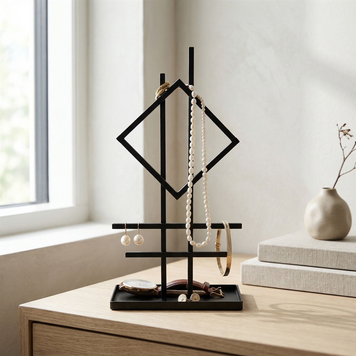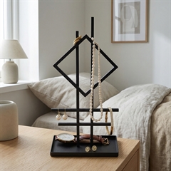 Smykkeholderen er lavet i metal der er pulverlakeret i en mat sort farve.