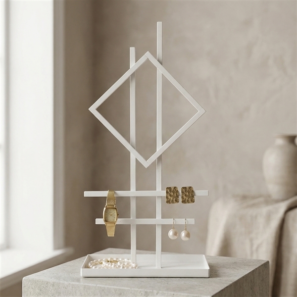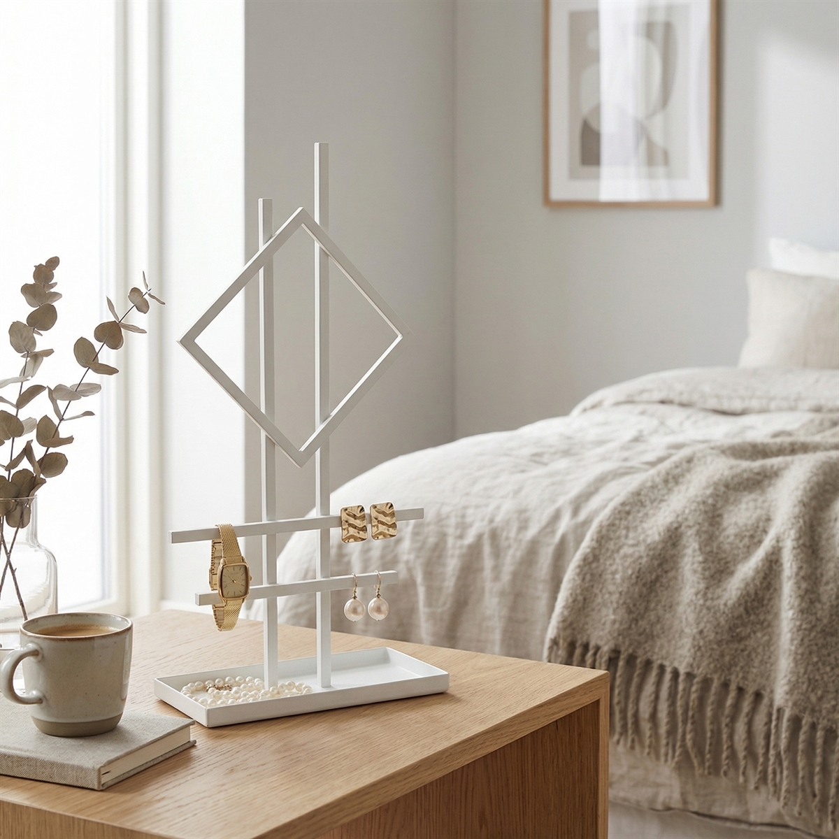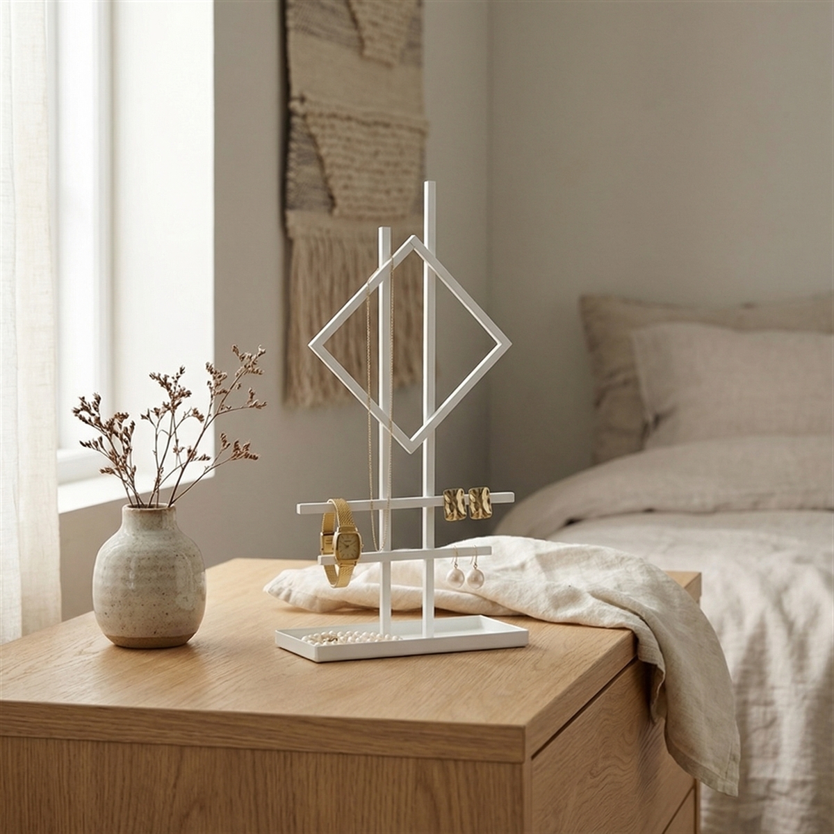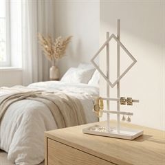 Smykkeholderen er lavet i metal der er pulverlakeret i en mat hvid farve.