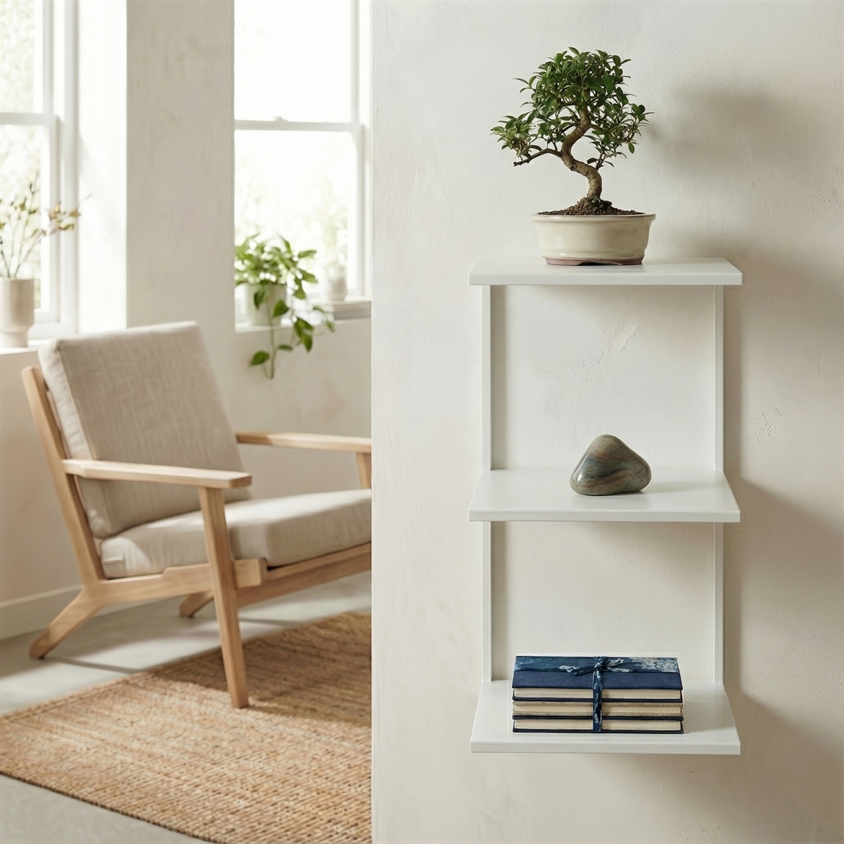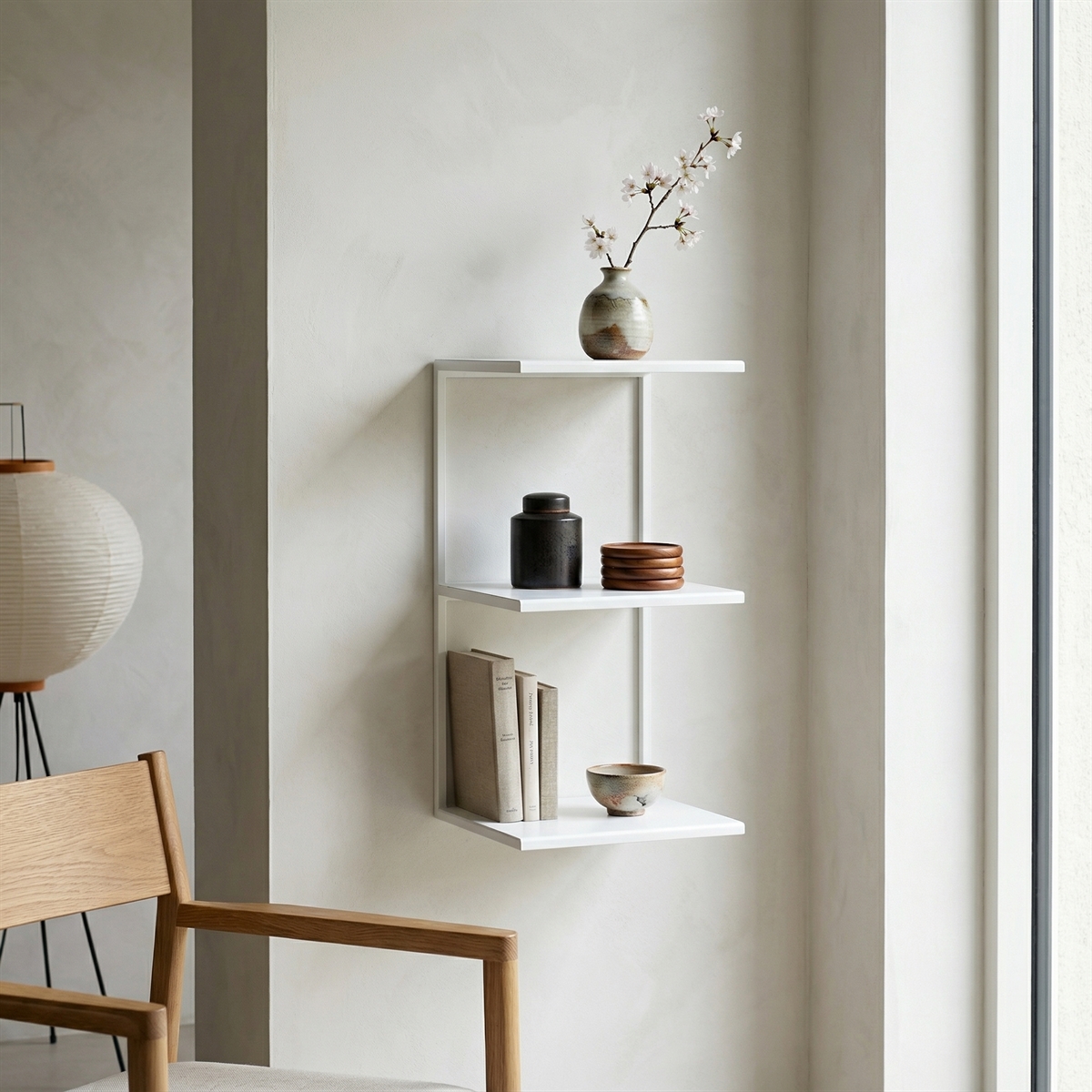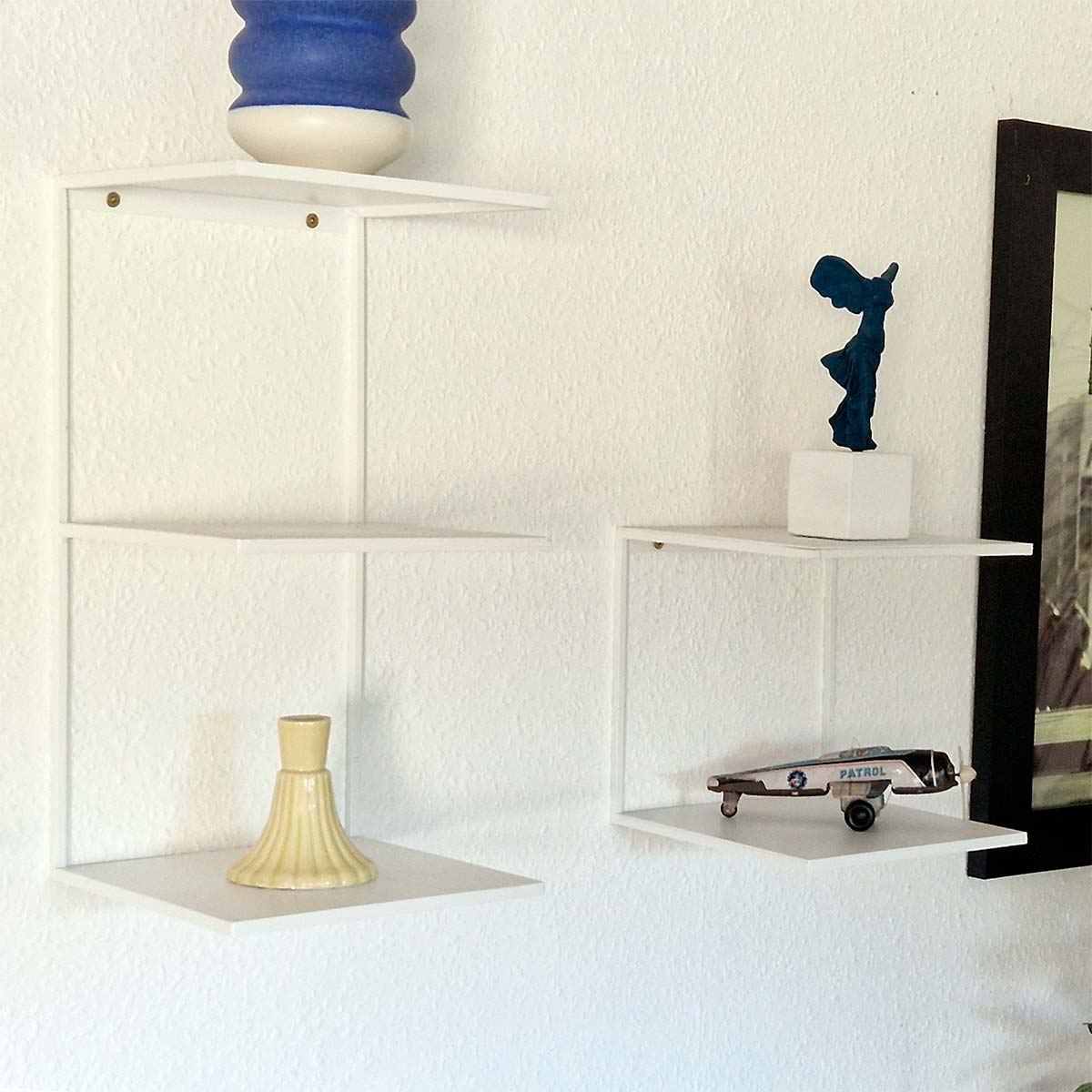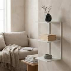 Como Hylde i mat hvid metal med 3 hylder til opbevaring og dekoration. Beregnet til at hænge på væggen til display af dine yndlingsgenstande, blomster eller som natbord.