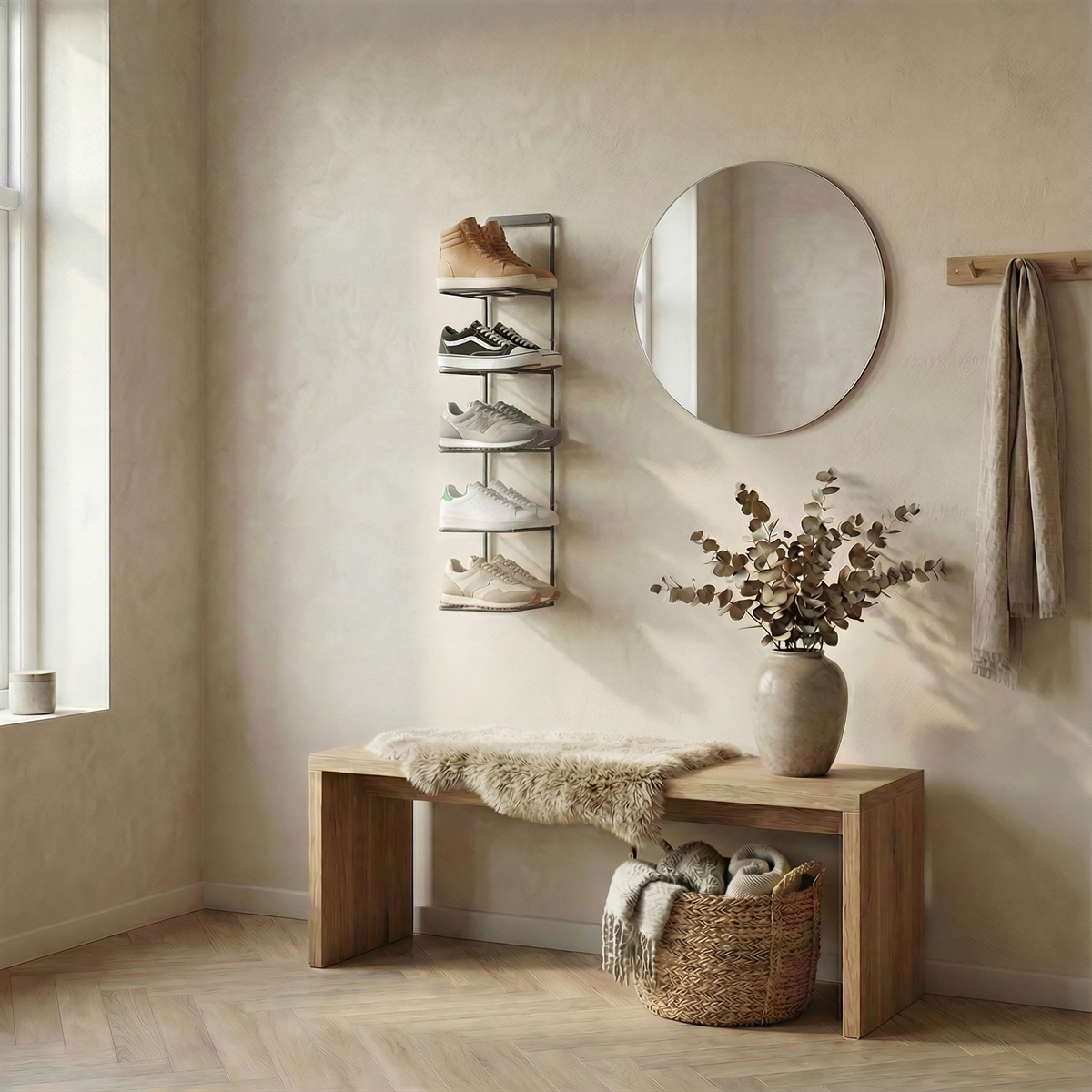 Skoreolen hænges på væggen så du kan opbevare dine sko i hjemmet. Skoreolen er lavet så skoene står med siden til.