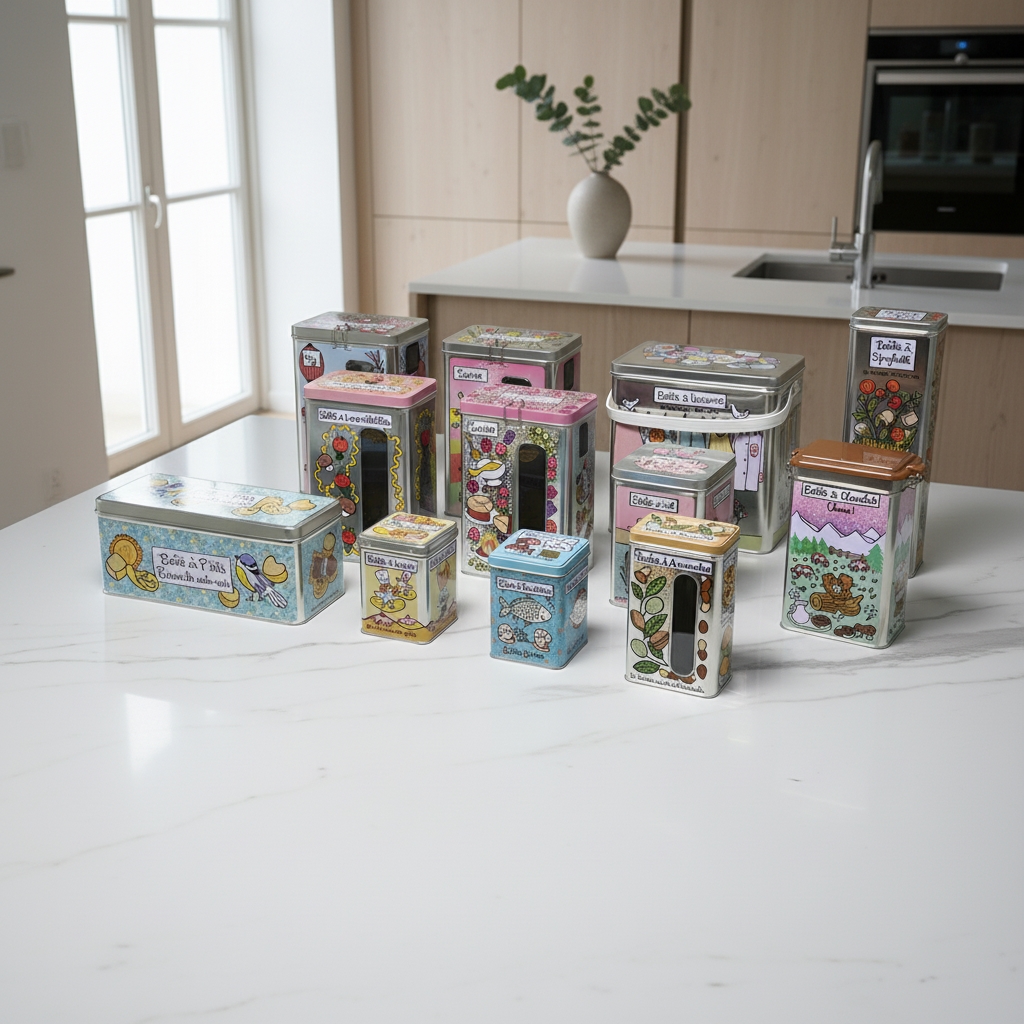 Giv dine suppehorn et stilfuldt hjem med denne charmerende metaldåse, prydet med nostalgiske illustrationer, skabt af den franske kunstner Valérie Nylin.