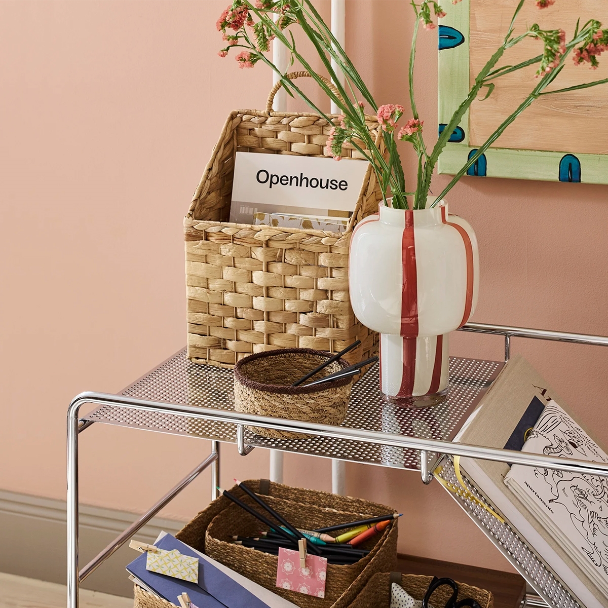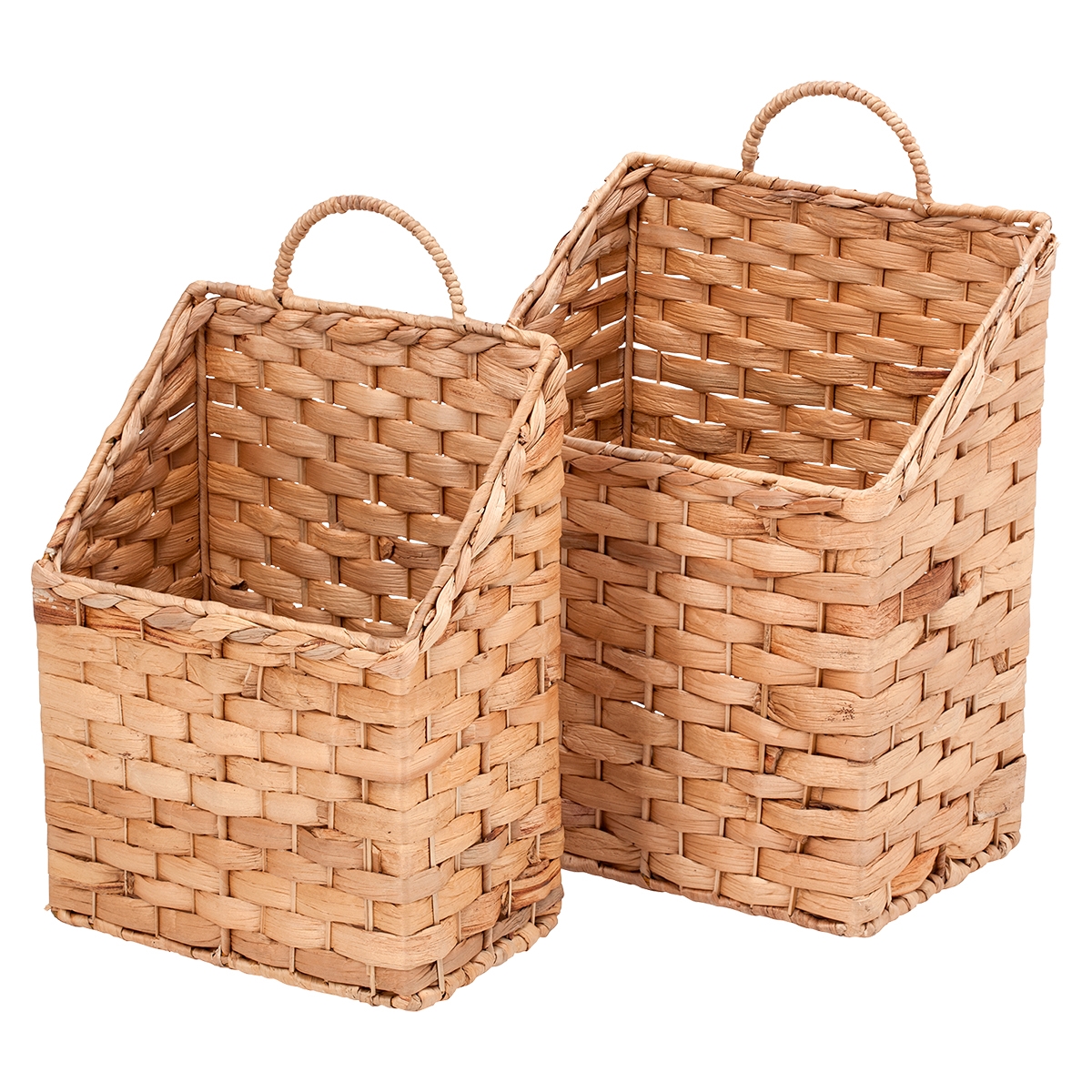 Sæt med to stk. kurve til at hænge på væggen fra svenske Dixie. Fremstillet i hånden af flettet vandhyacint. En god stor rummelig kurv til entréen til opbevaring af huer og vanter eller til opbevaring af bøger og magasiner