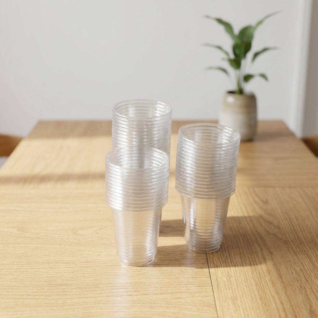Drikkeglassene er fremstillet af RPET plast som er lavet af genbrugte plastflasker.
